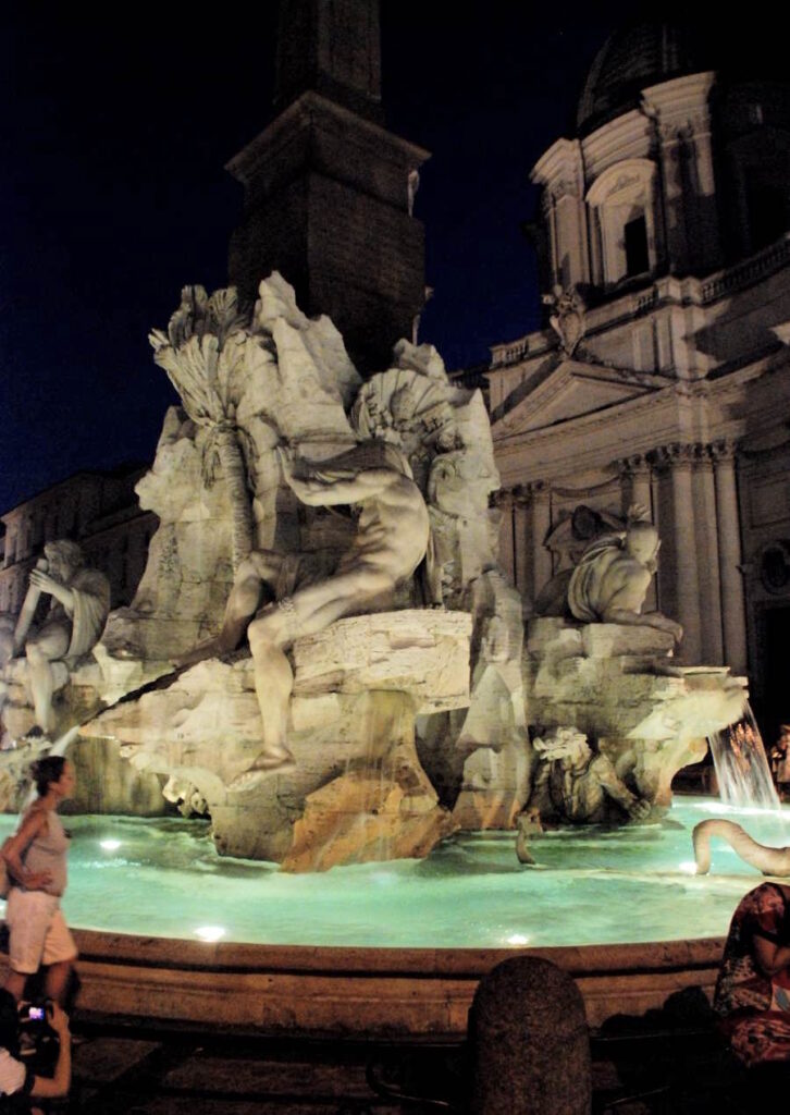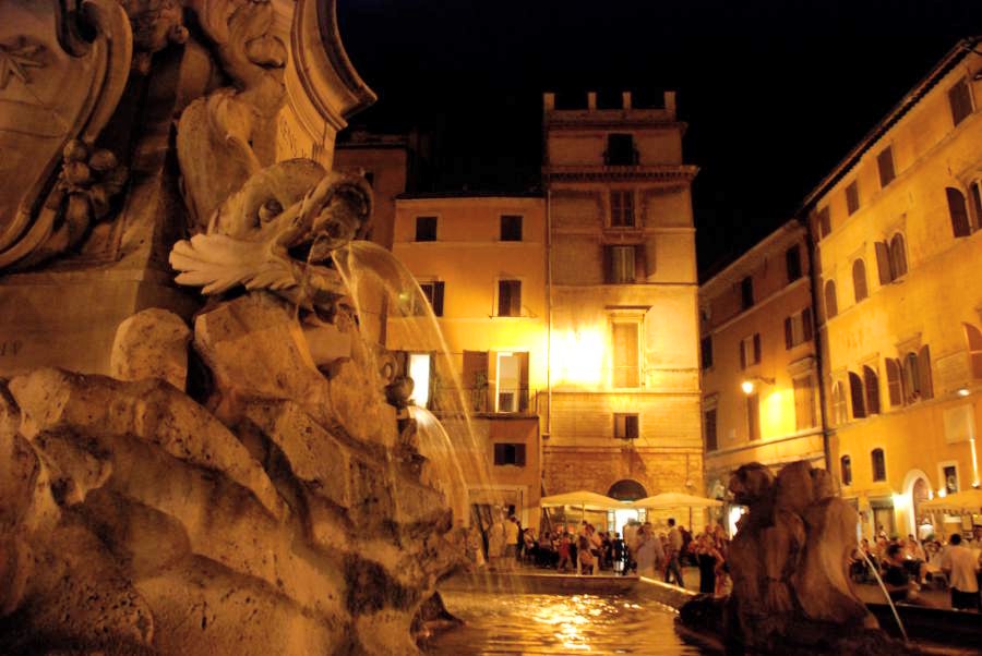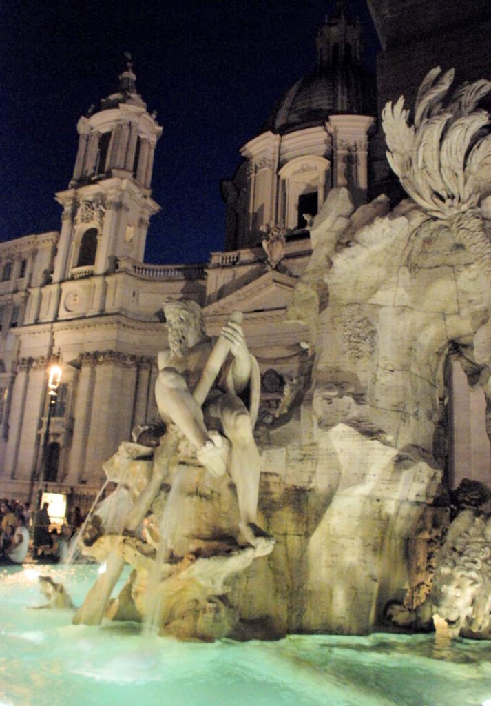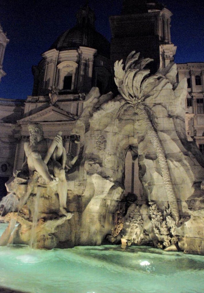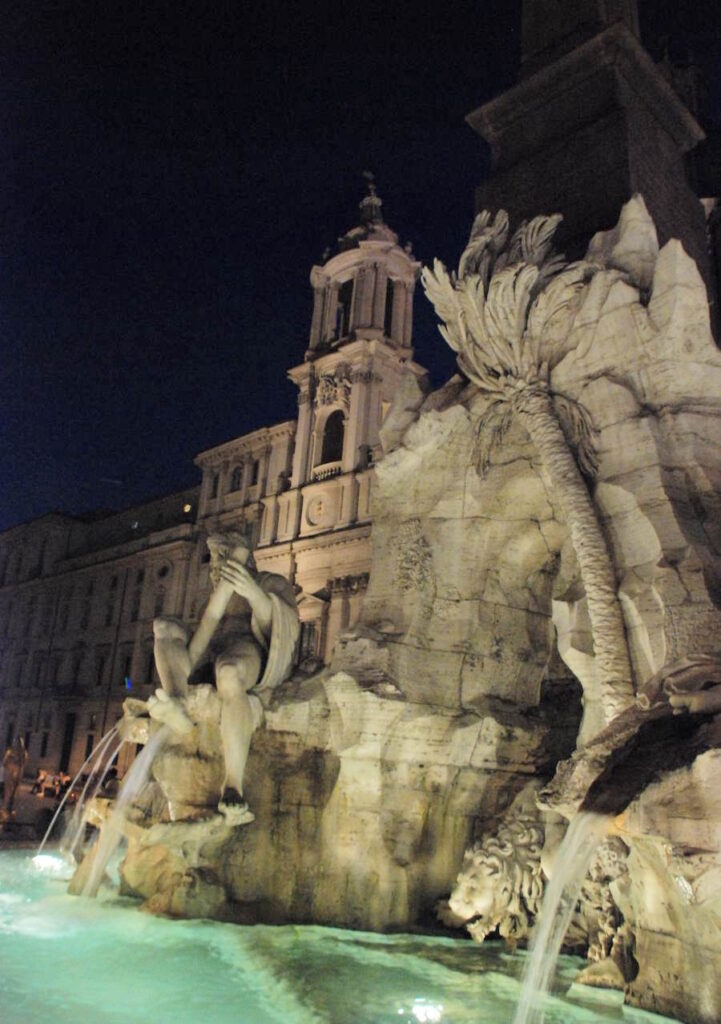Retour à la Piazza Navona. Les lumières de la ville font briller de mille feux la plus belle place de Rome. Les dieux marins de la fontaine du Bernin se parent de halos verts mystérieux.