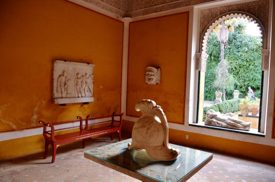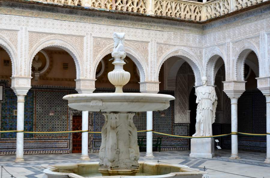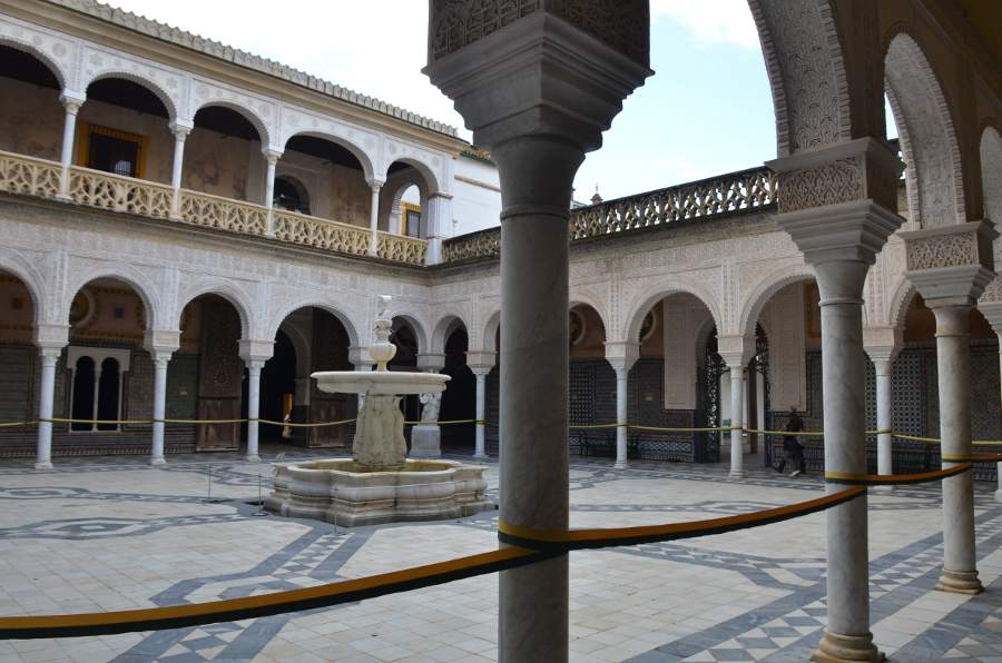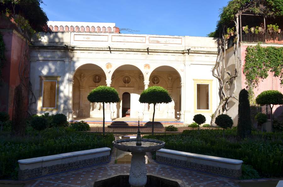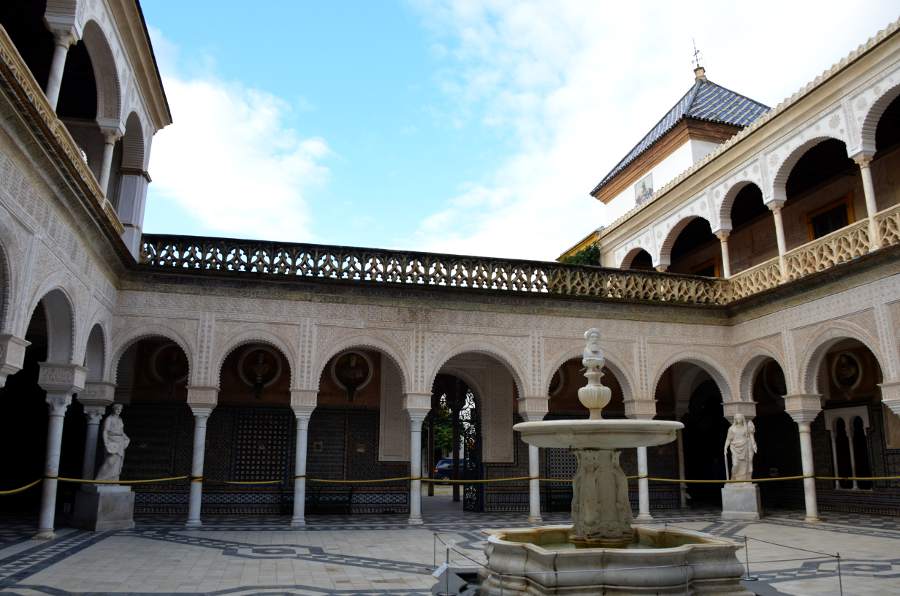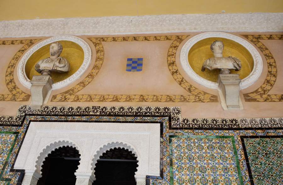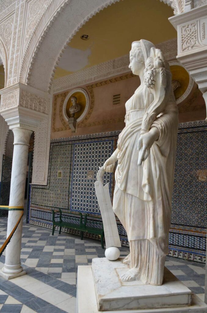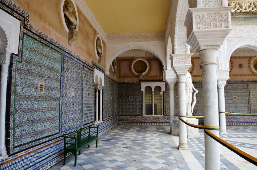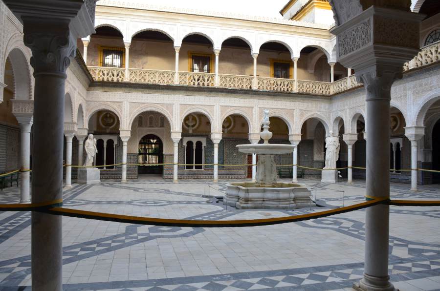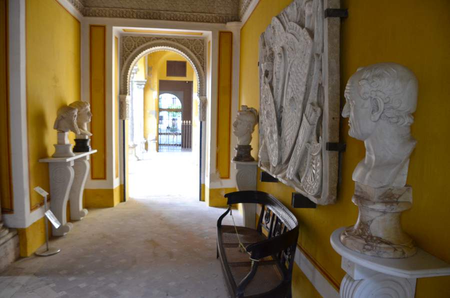 Dès le patio central, on peut admirer les bustes d’empereurs romains placés dans les corniches. Tous étaient rapportés d’Italie. Tout comme les magnifiques statues grecques et romaines qui ornent tous les coins du patio. Sous les arcades, la beauté des azulejos est à couper le souffle. Ils se mêlent étroitement au style mudéjar des arcades et des piliers qui soutiennent l’étage. Enfin, le sol dallé de marbre conduit au centre du patio où se dresse une belle fontaine romaine surmontée d’une tête à deux faces.