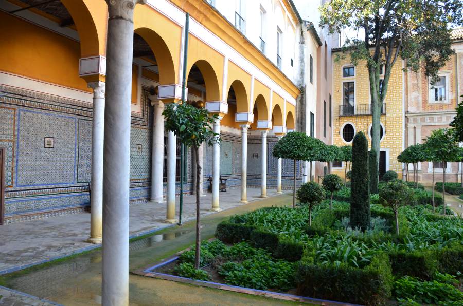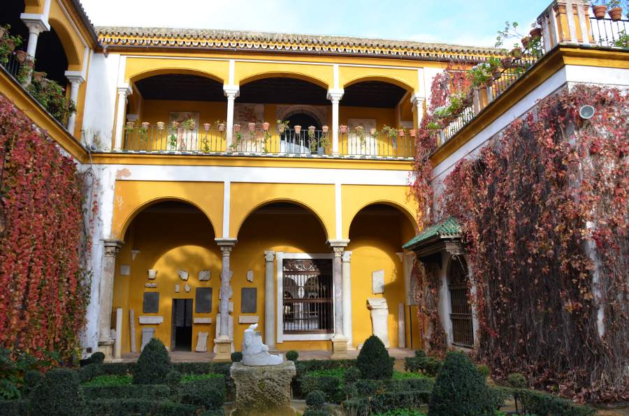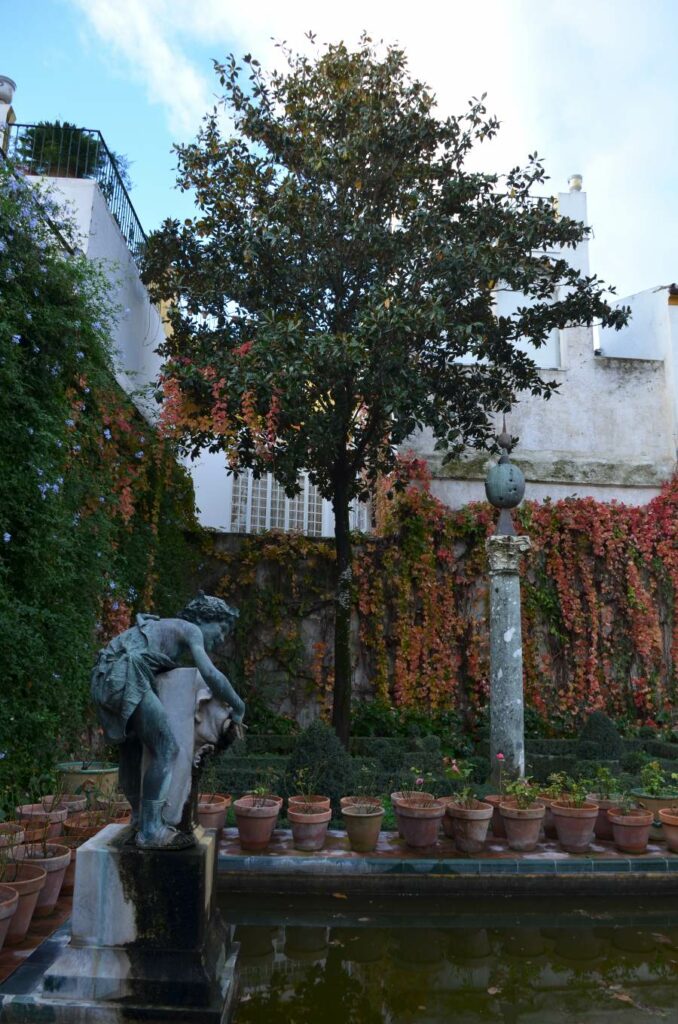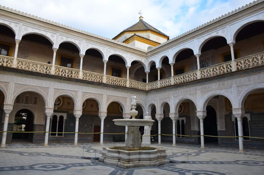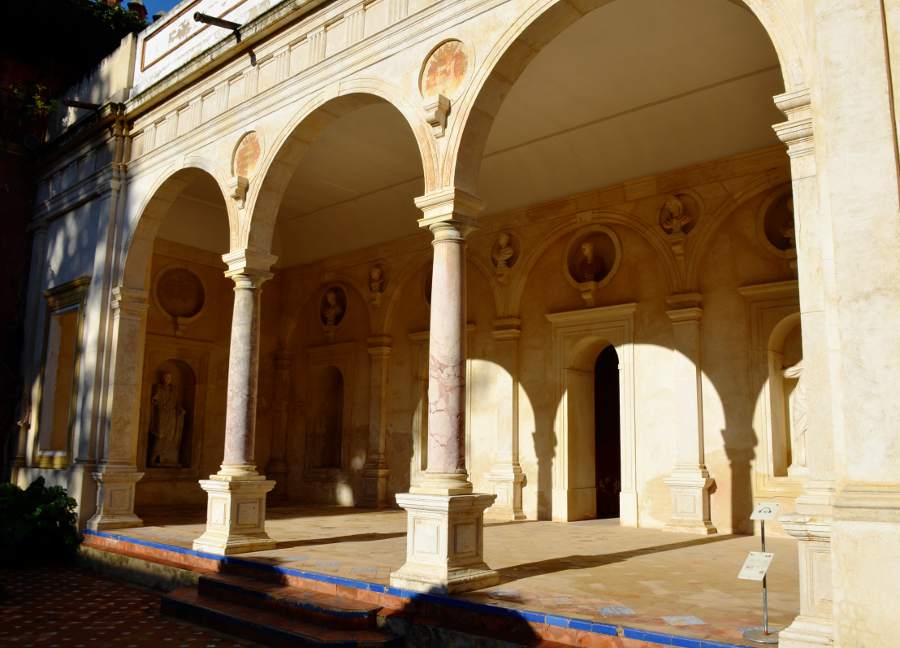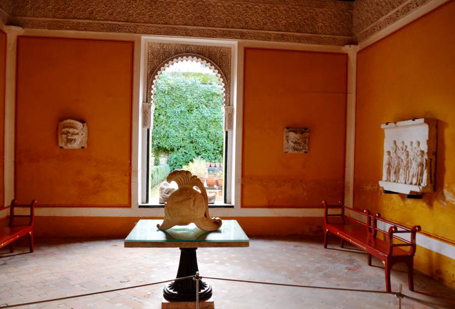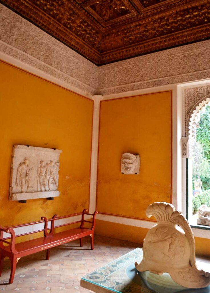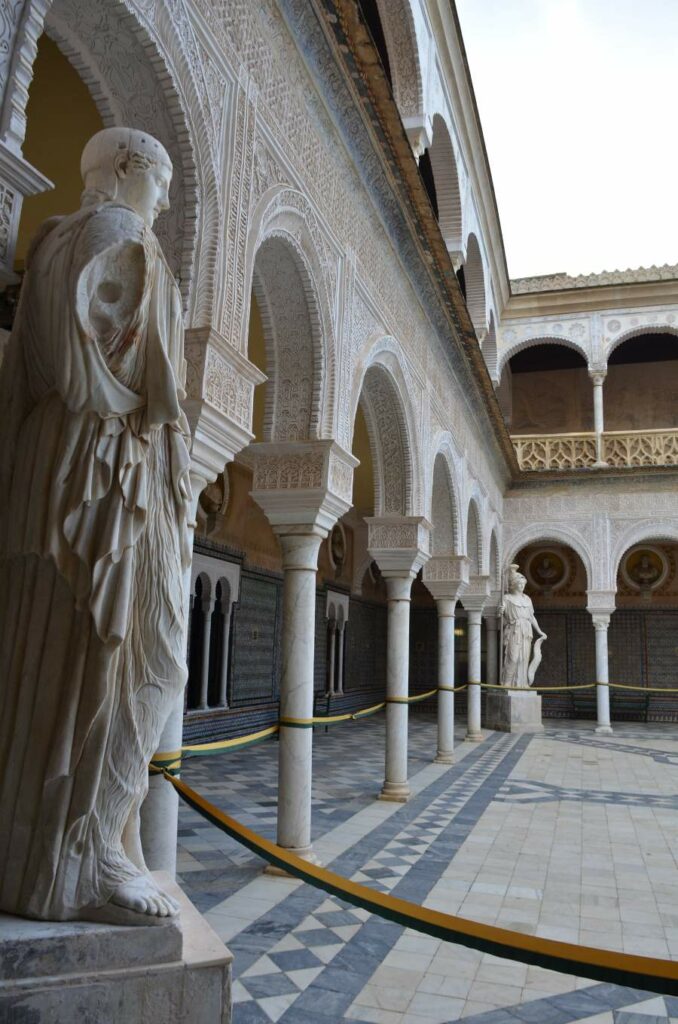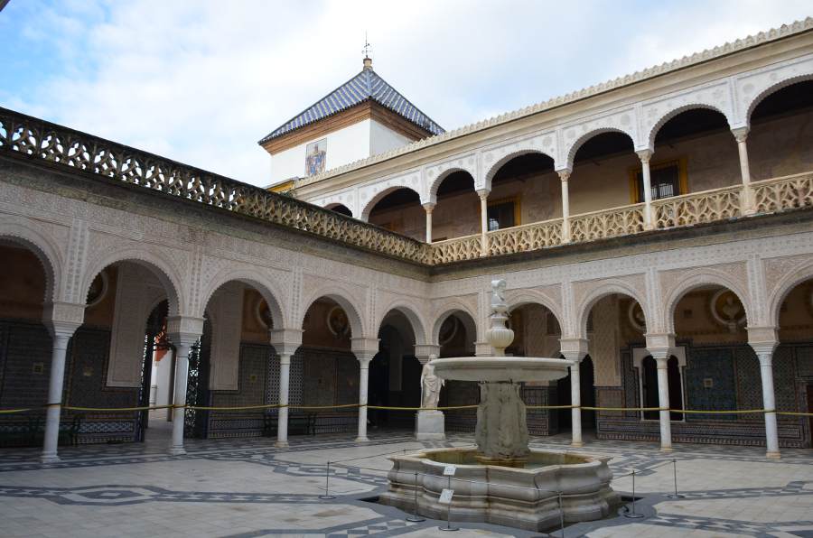 Dès le patio central, on peut admirer les bustes d’empereurs romains placés dans les corniches. Tous étaient rapportés d’Italie. Tout comme les magnifiques statues grecques et romaines qui ornent tous les coins du patio. Sous les arcades, la beauté des azulejos est à couper le souffle. Ils se mêlent étroitement au style mudéjar des arcades et des piliers qui soutiennent l’étage. Enfin, le sol dallé de marbre conduit au centre du patio où se dresse une belle fontaine romaine surmontée d’une tête à deux faces.