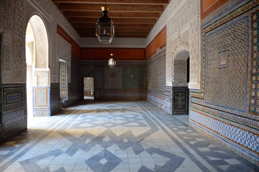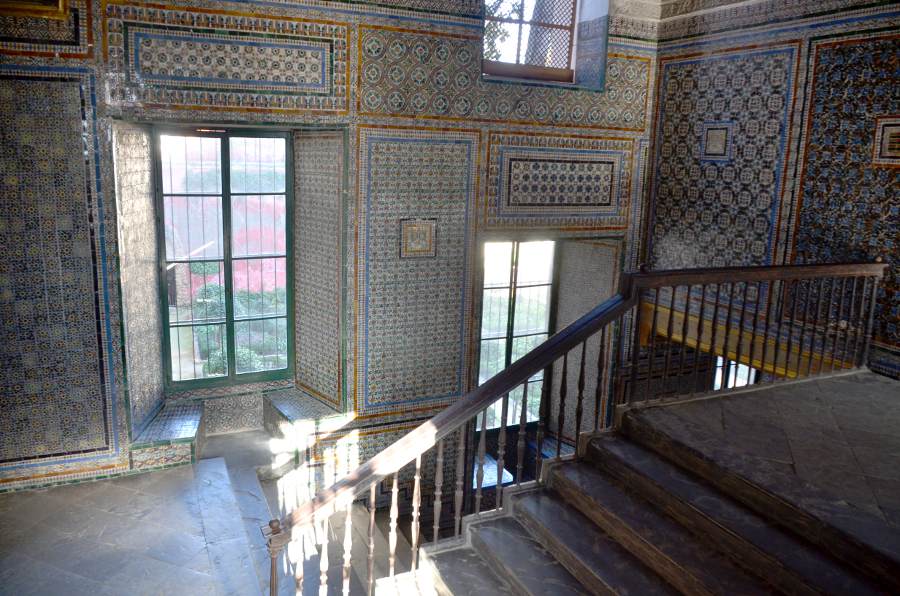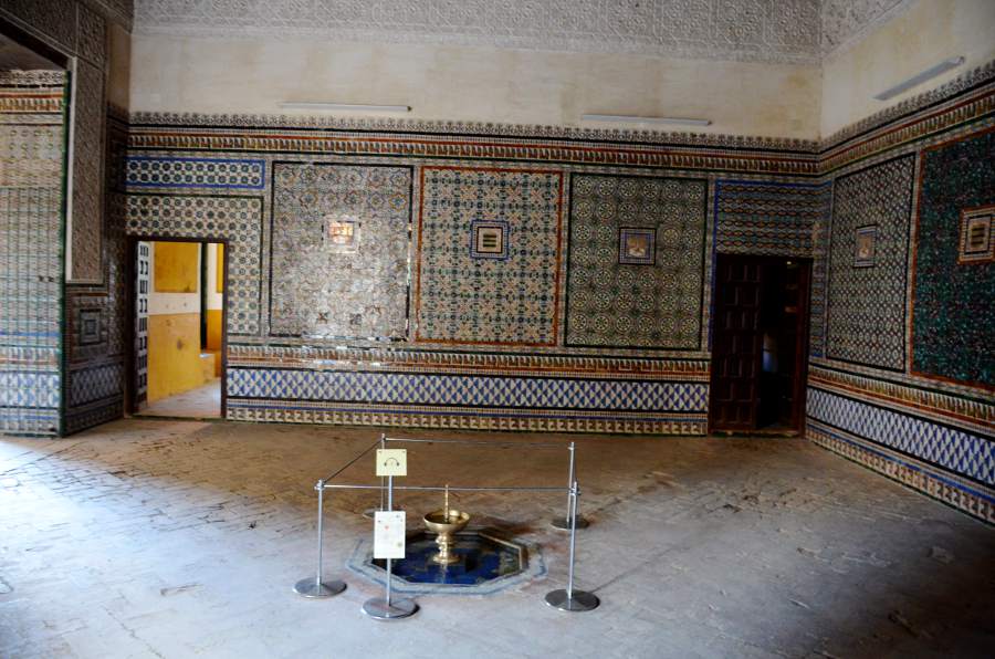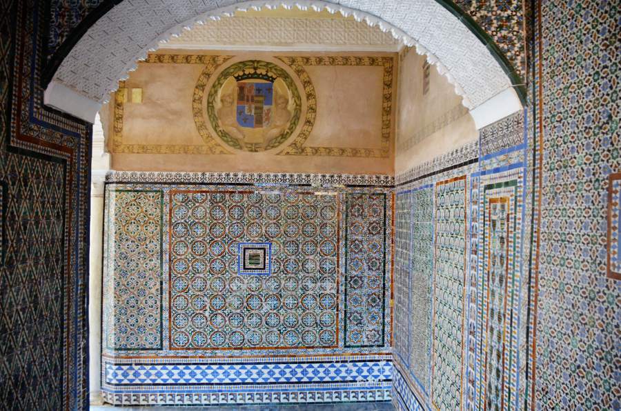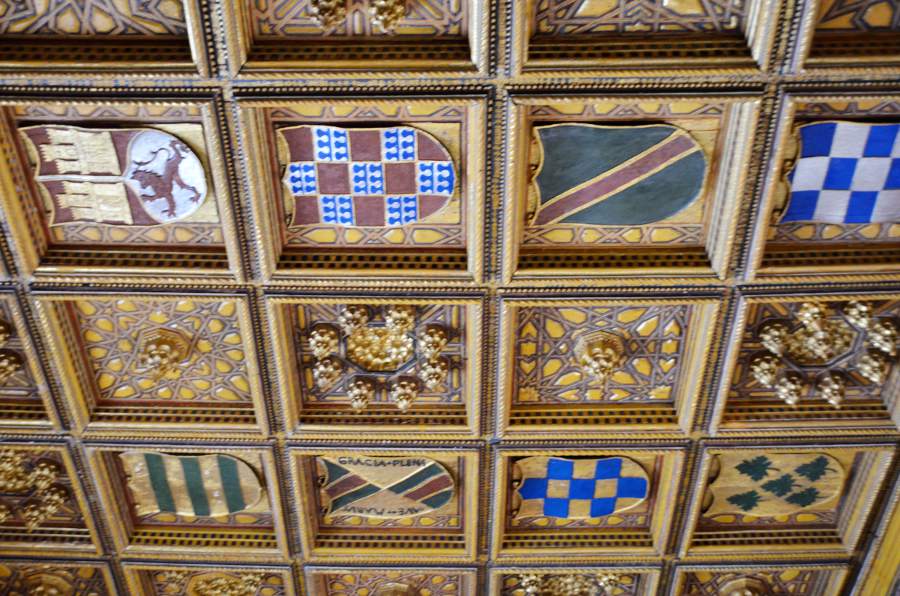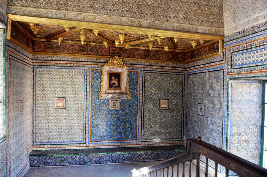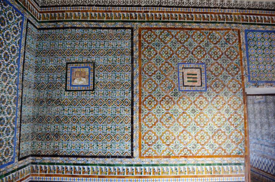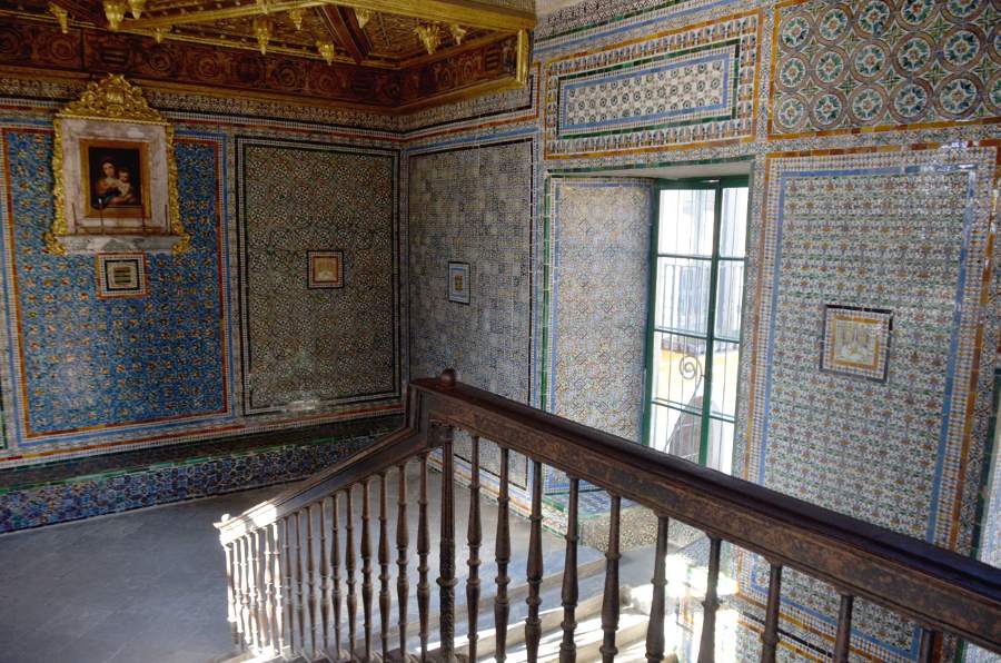 Les salles autour du patio central se ressemblent toutes sans être jamais les mêmes. Les azulejos se marient admirablement avec l’art mudéjar des corniches et des portes. Les plafonds à caissons se succèdent. Les marqueteries aussi. Motifs moulés et plâtres complètent le décor.
