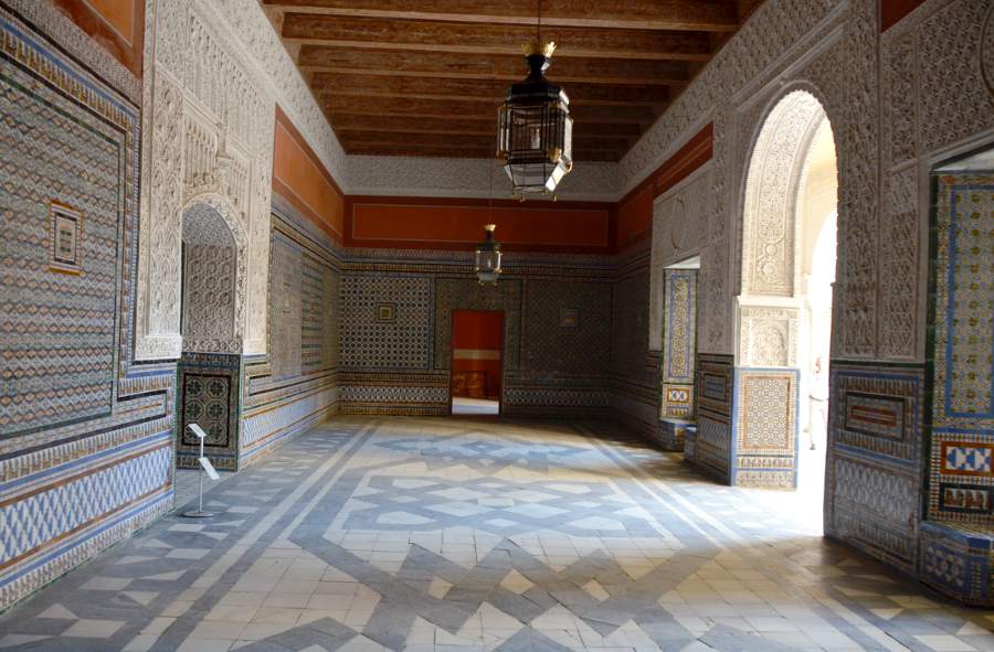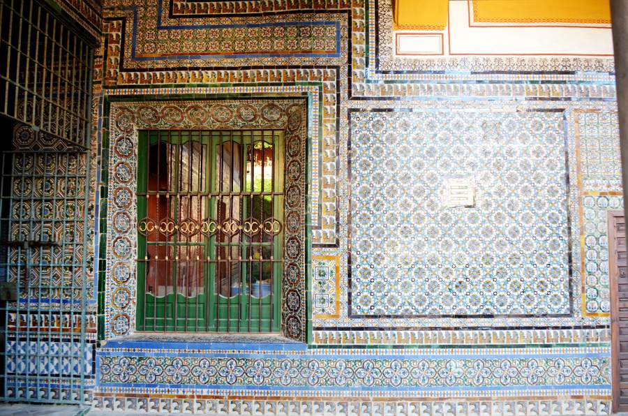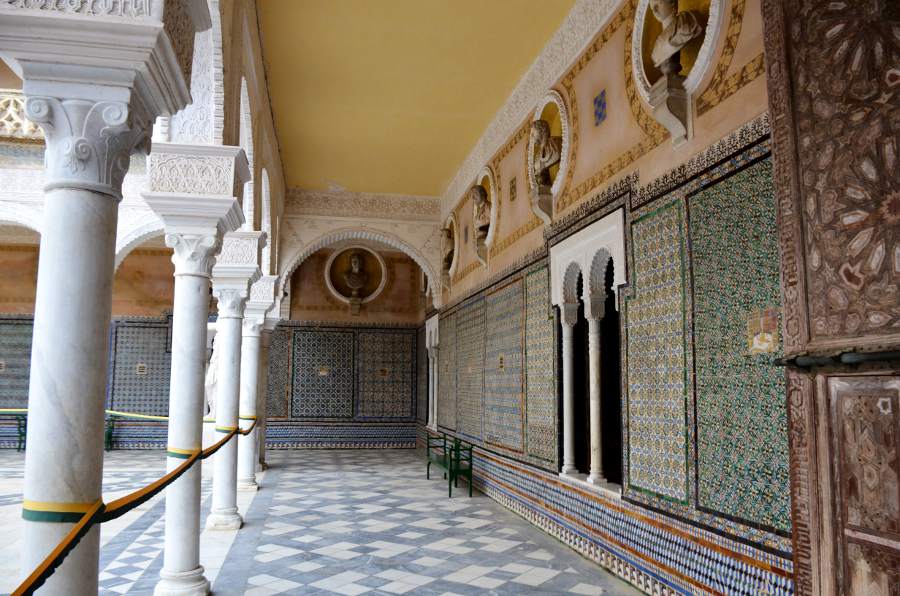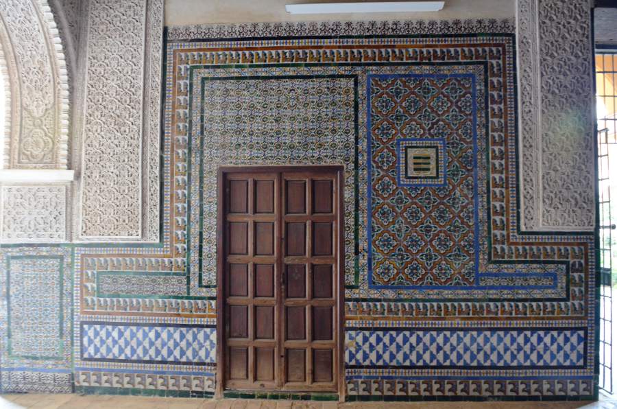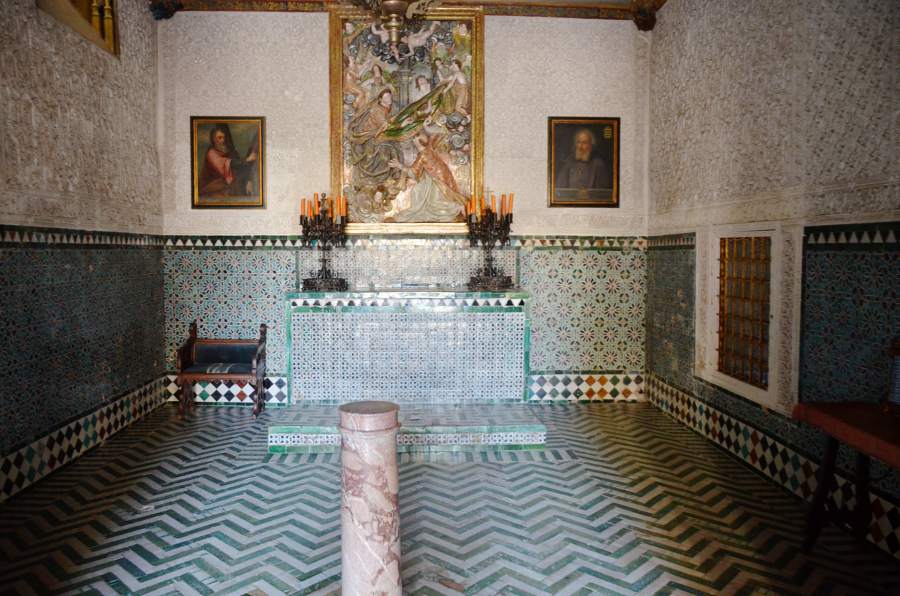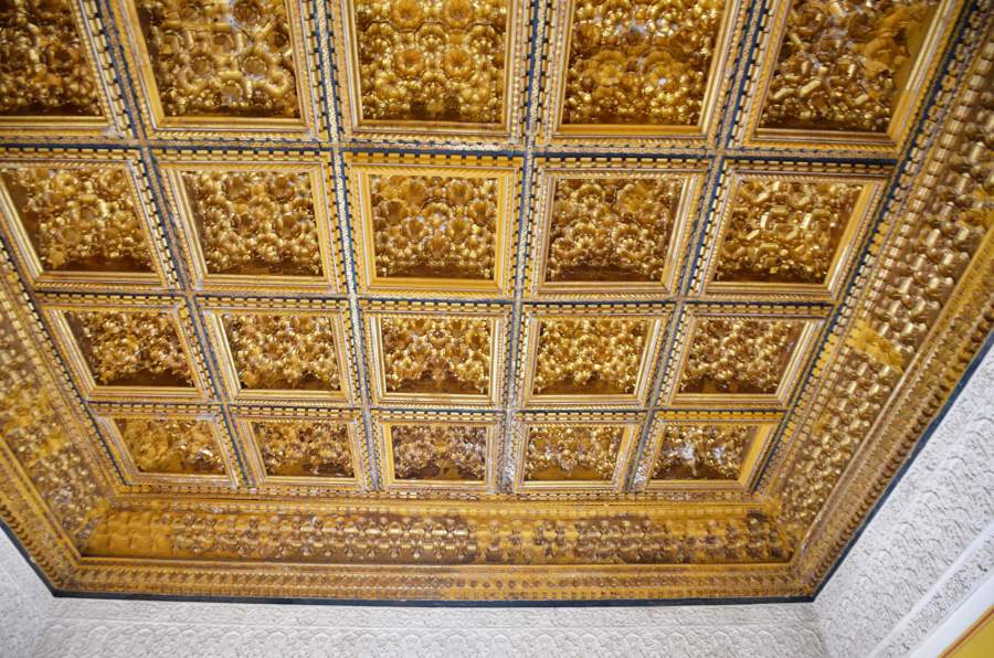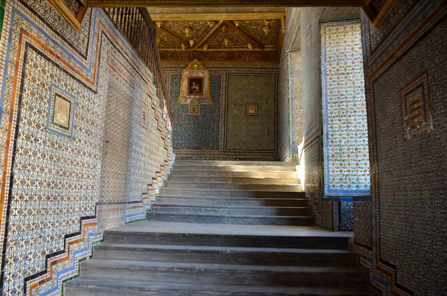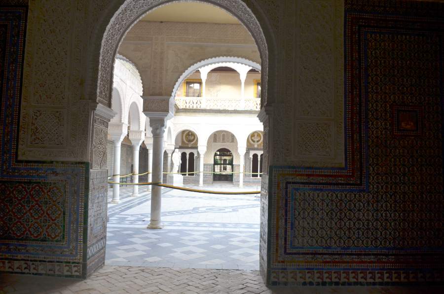 Les salles autour du patio central se ressemblent toutes sans être jamais les mêmes. Les azulejos se marient admirablement avec l’art mudéjar des corniches et des portes. Les plafonds à caissons se succèdent. Les marqueteries aussi. Motifs moulés et plâtres complètent le décor.