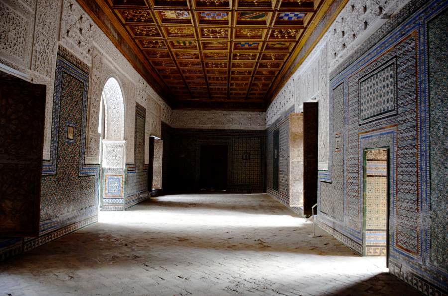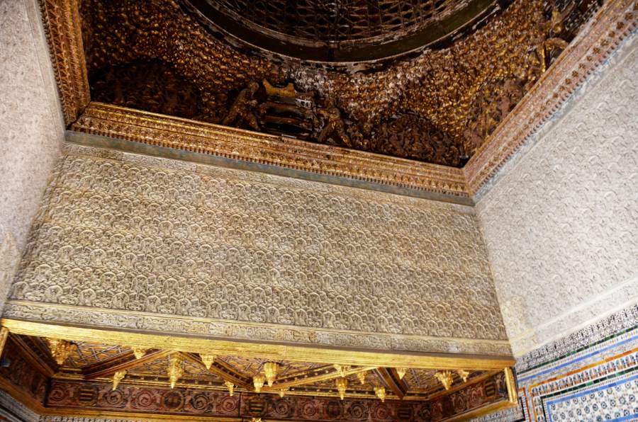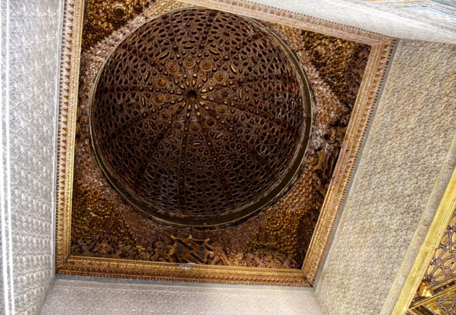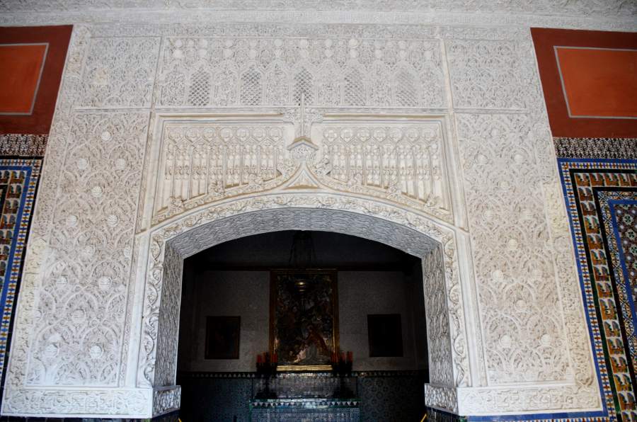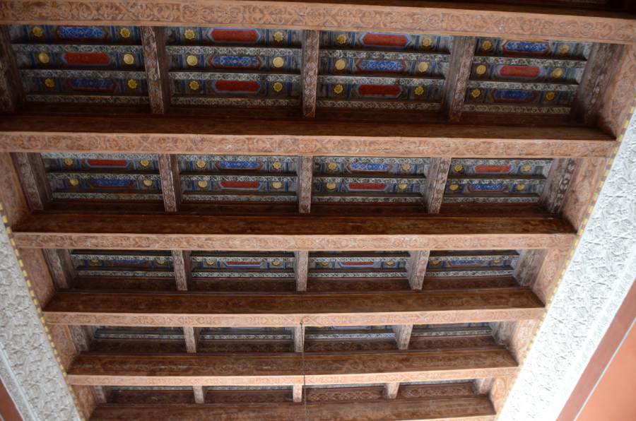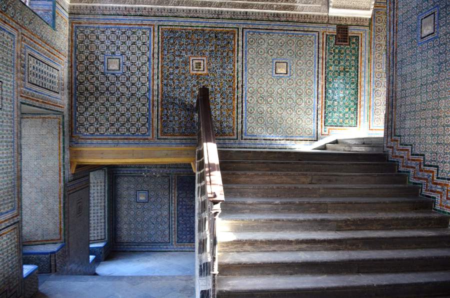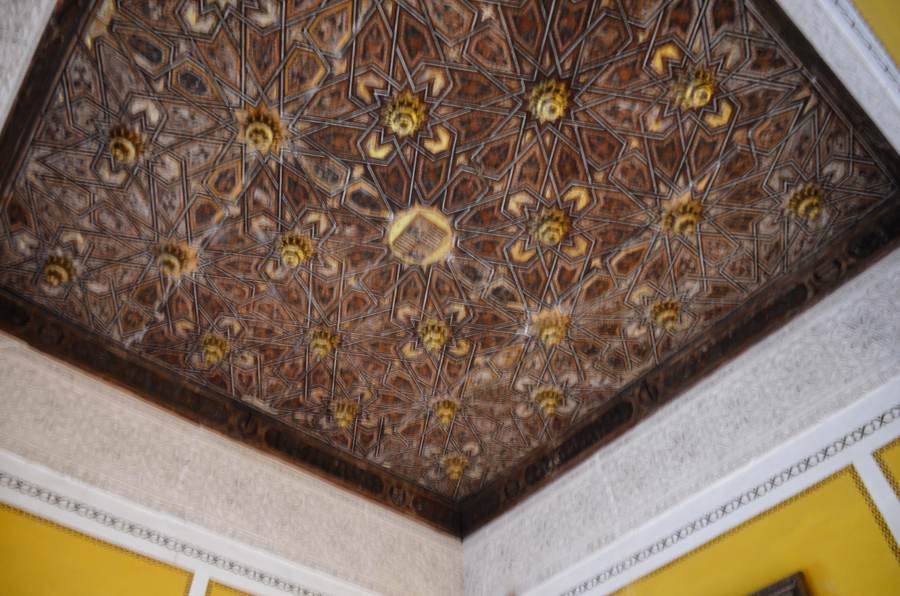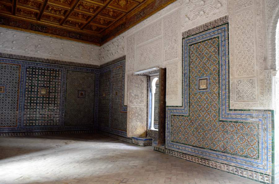 Les salles autour du patio central se ressemblent toutes sans être jamais les mêmes. Les azulejos se marient admirablement avec l’art mudéjar des corniches et des portes. Les plafonds à caissons se succèdent. Les marqueteries aussi. Motifs moulés et plâtres complètent le décor.