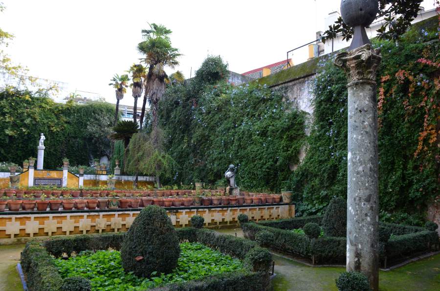 De l’autre côté du patio central, on sort et on accède directement à un magnifique petit jardin plein de senteurs, peuplés par quelques statues, un bassin, des massifs, des arbres fruitiers, des orangers et des bougainvillées. Le grand jardin est organisé autour d’une fontaine et s’étend sous la galerie et la loggia de la villa romaine.