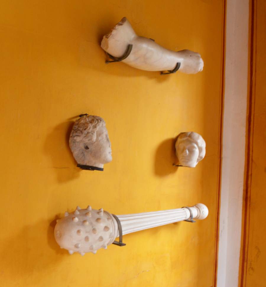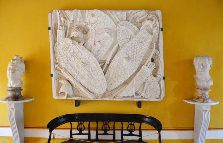 La loggia rassemble bas-reliefs et sculptures romaines. Bustes, masques et casques forment une parfaite harmonie dans la pièce principale qui donne sur le jardin.