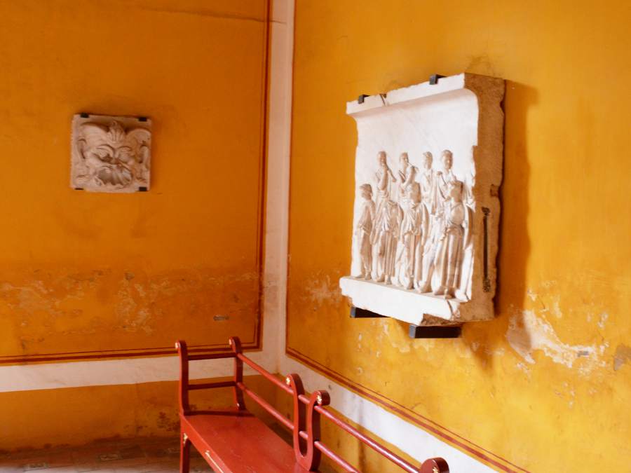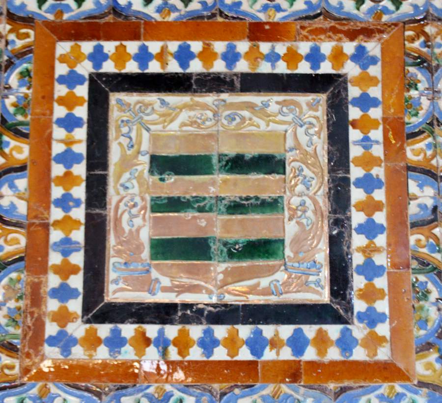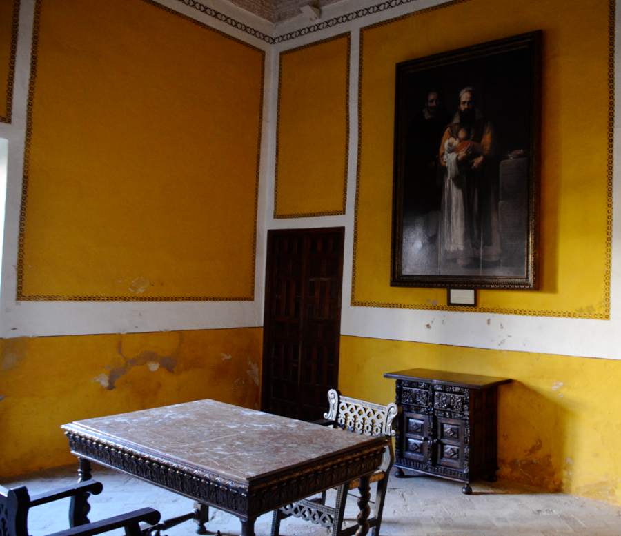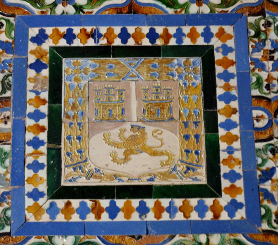 À droite en entrant, on passe directement dans le salon du Prétoire. Attention les yeux ! Des murs d’azulejos d’une grande beauté et en levant les yeux, un plafond à caissons en bois sculpté où apparaissent les armoiries des familles Enriquez et Ribera, propriétaires des lieux.