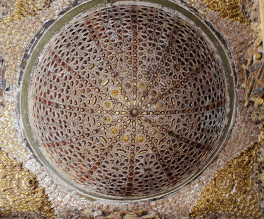 Enfin, la visite s’achève par le grand escalier qui mène au premier étage de la villa (visite payante et pas très intéressante, je m’arrêterai donc là…). Si l’escalier est entièrement recouvert de mosaïques, il est surtout coiffé d’une extraordinaire coupole de bois en nid d’abeilles. Stupéfiant.