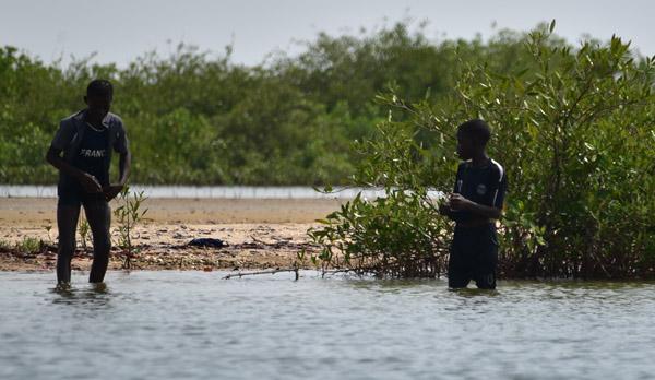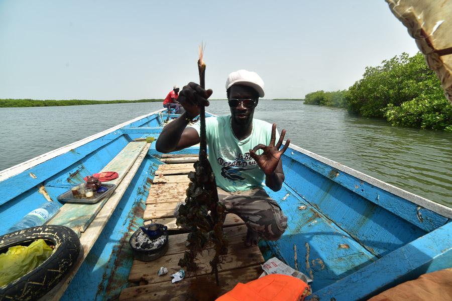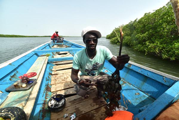 Désormais, nous nous enfonçons plus profondément dans le delta. Nous navigons le long de la mangrove. Notre piroguier me montre les huîtres que les jeunes du delta tentent de décrocher des racines de palétuviers.