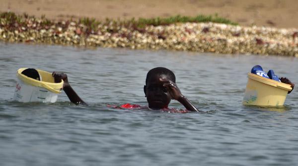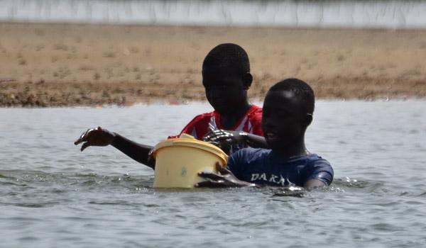 En s’approchant de plus près, on devine que certains, tout en chahutant, nettoient leurs chaussures en plastique dans le fleuve.