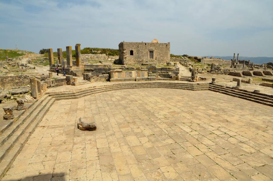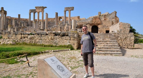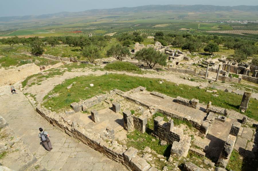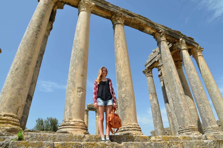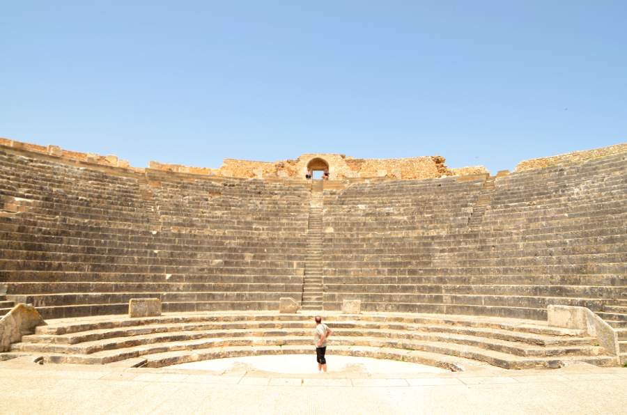 Comme en 2011, impossible de commencer la visite sans passer d’abord par la case théâtre romain. Construit en 168, il reste l’un des mieux conservés d’Afrique romaine et peut accueillir 3.500 spectateurs sur 25 rangées de gradins. Une dédicace, gravée sur le fronton de la scène et sur le portique qui domine la ville, rappelle son constructeur, P. Marcius Quadratus. Une chose est sûre, la vue sur la vallée est absolument fantastique. Au loin, une forêt d’oliviers se dresse sur les collines environnantes. Tout cela vaut bien une photo-souvenir avec toute la famille !