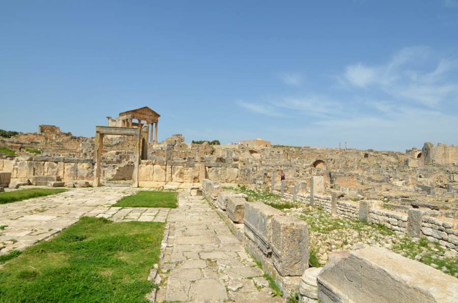 Passé le théâtre, un long chemin pierré mène tout droit au capitole romain, temple du IIe siècle dédié à la triade protectrice de Rome : Jupiter, Junon et Minerve. Il est dédié de manière secondaire à la sauvegarde des empereurs Lucius Verus et Marc Aurèle ; il a sans doute été achevé en 166-167. Les murs en opus africanum et l’entablement du portique ont été restaurés entre 1903 et 1910. On y a découvert une crypte sous le sol de la cella en 1955.