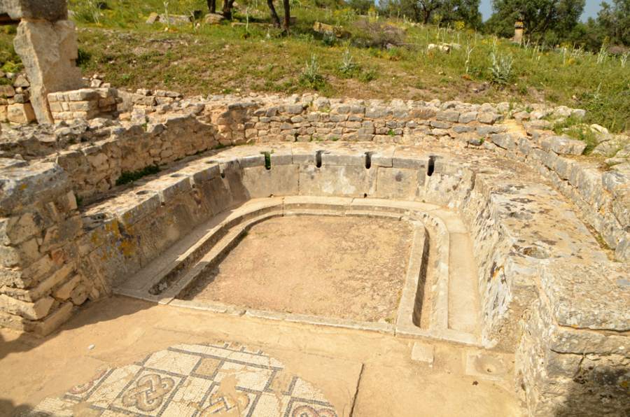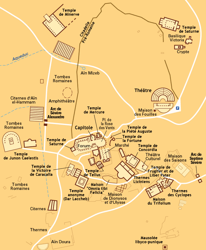 En s’éloignant un peu de l’agora et de cette superbe place des vents, on se dirige vers l’arc de Sévère Alexandre à côté duquel sont creusées les grandes citernes qui alimentaient la cité antique en eau. Toujours aussi impressionnantes. Les six citernes d’Aïn El Hammam, situées à proximité du temple de Junon Caelestis, peuvent contenir 6.000 m³ et sont particulièrement ruinées. Elles sont alimentées par une source située à 12 kilomètres et un aqueduc construit sous le règne de Commode et restauré dans le dernier quart du IVe siècle.