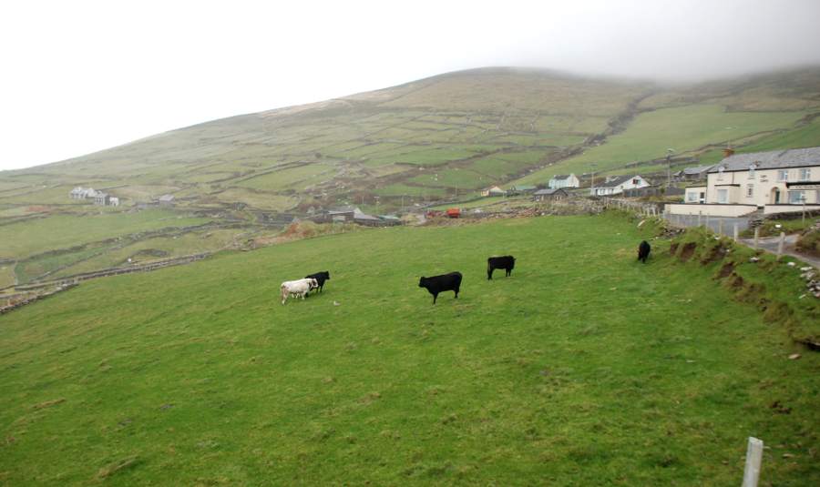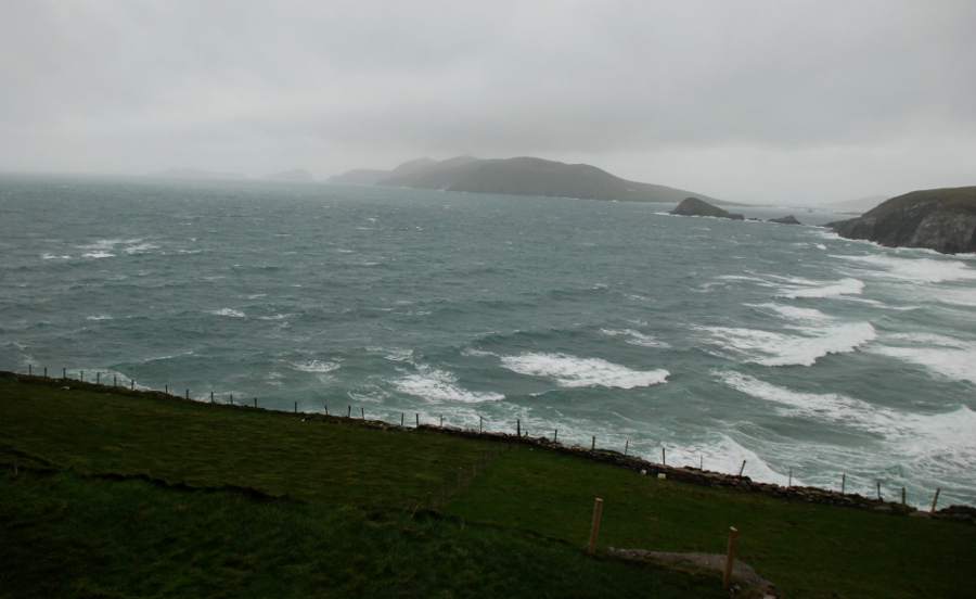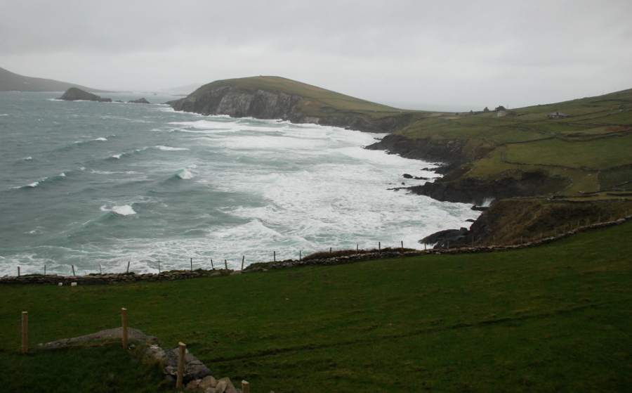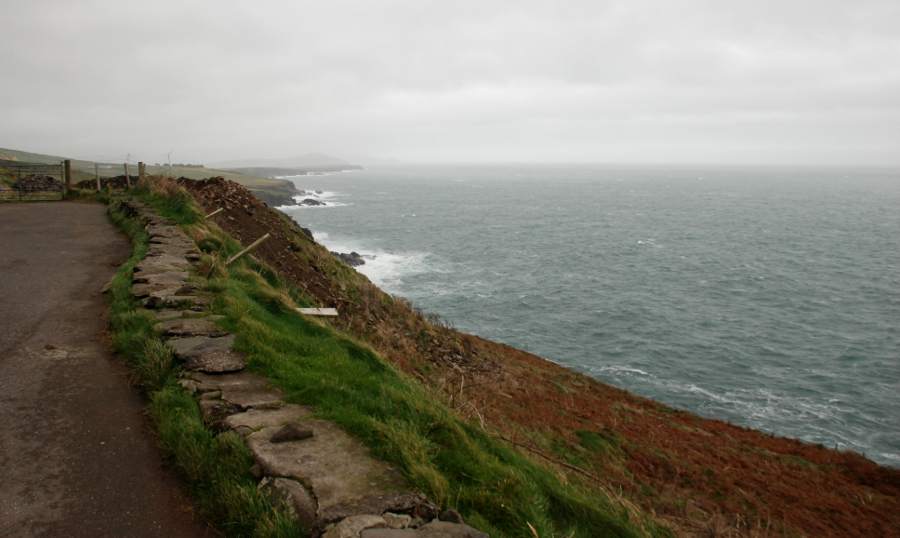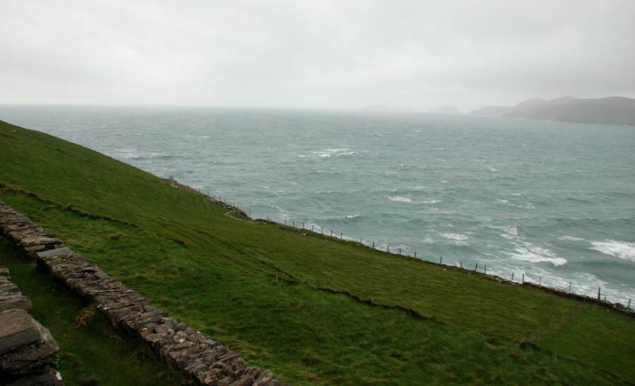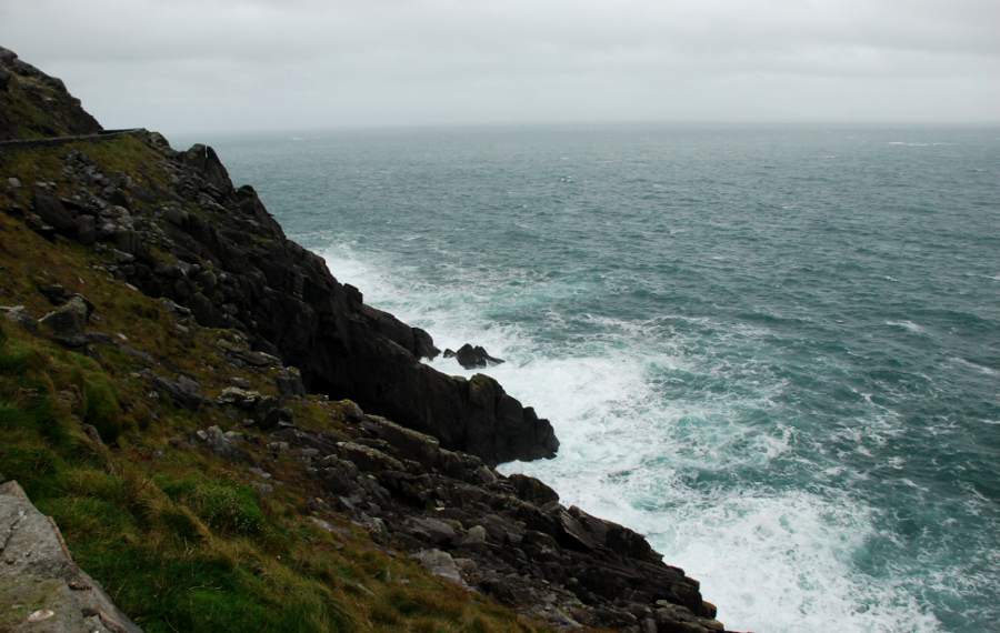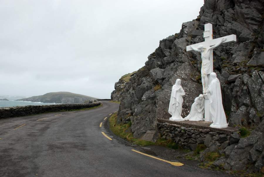 Le long de la Slea Head qui sillonne les côtes de la péninsule, on plonge au cœur du comté de Dingle. La route longe la corniche balayée par les vents et attaquée par les déferlantes de l’Océan atlantique. De minuscules murets de pierre délimitent encore les terres d’élevage où paisse une armée de moutons. La montagne plonge dans l’eau. Au détour d’un virage, une vierge blanche apparaît, symbole du naufrage, qui, plus bas, a coûté la vie à une dizaine de marins irlandais. Plus on s’approche de la pointe de la péninsule, plus les falaises sont déchiquetées par les vagues qui se fracassent contre elles.