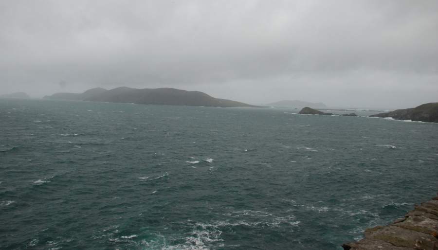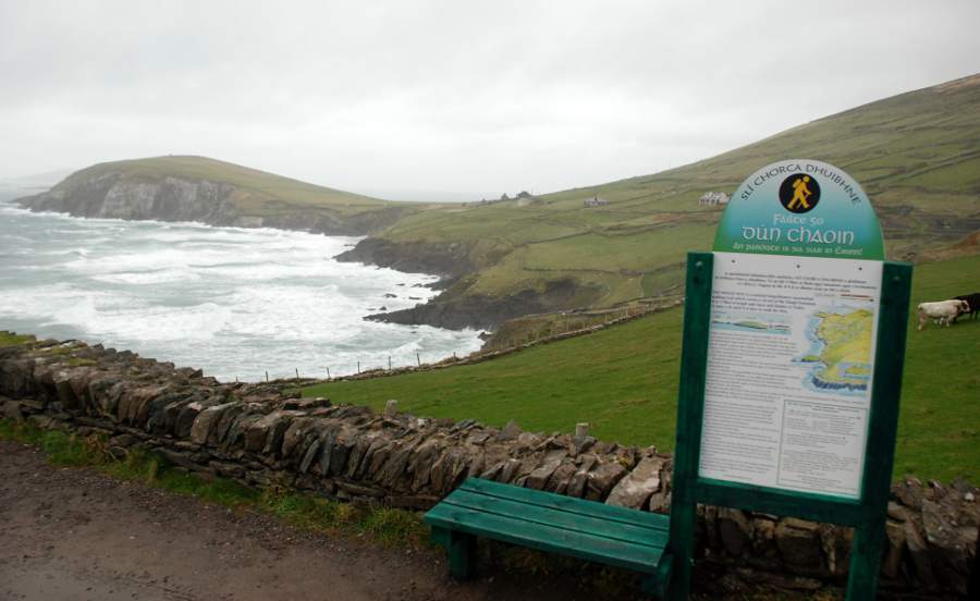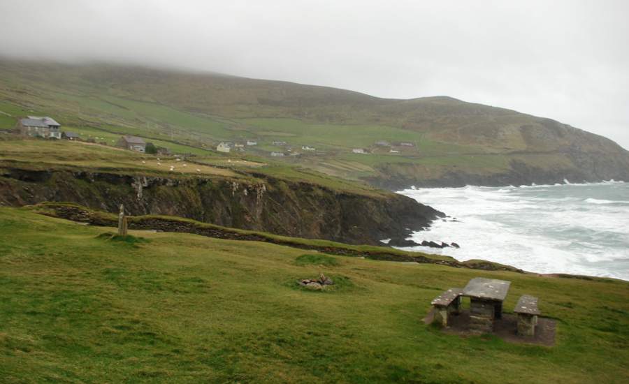 Enfin, on arrive à la pointe de la péninsule de Dingle. Magnifiques falaises d’où l’on voit la silhouette des îles Basket, uniquement peuplées de moutons. Au bas de la falaise, une petite plage où accostaient autrefois les contrebandiers. Vaches et moutons se disputent les terres d’élevage. En regardant vers le nord, on aperçoit la côte déchiquetée par les vagues, dos verts qui semblent glisser inexorablement dans l’océan. Des bancs permettent de profiter à plein du spectacle de la force de la nature.