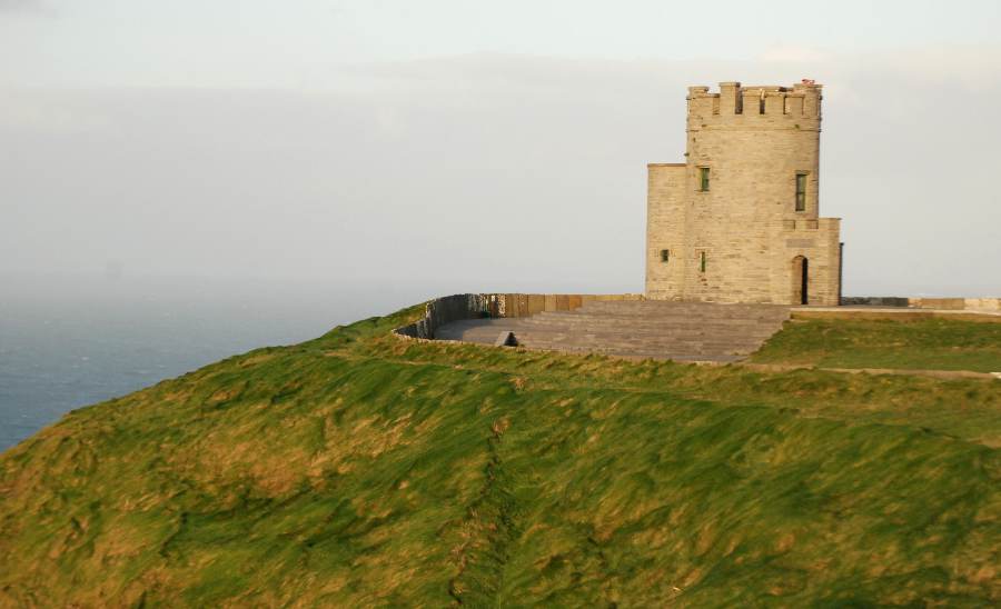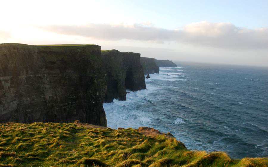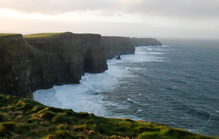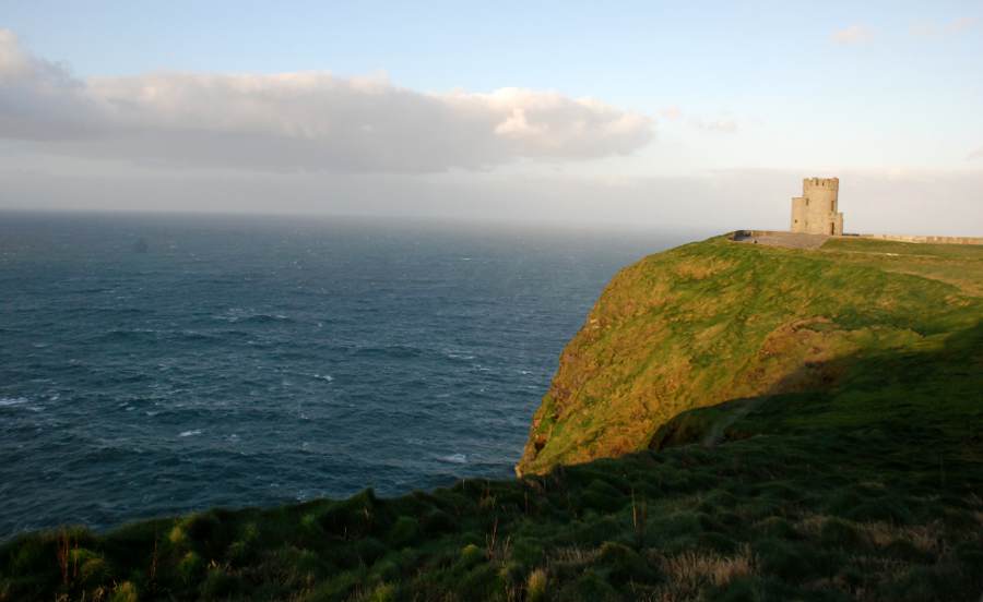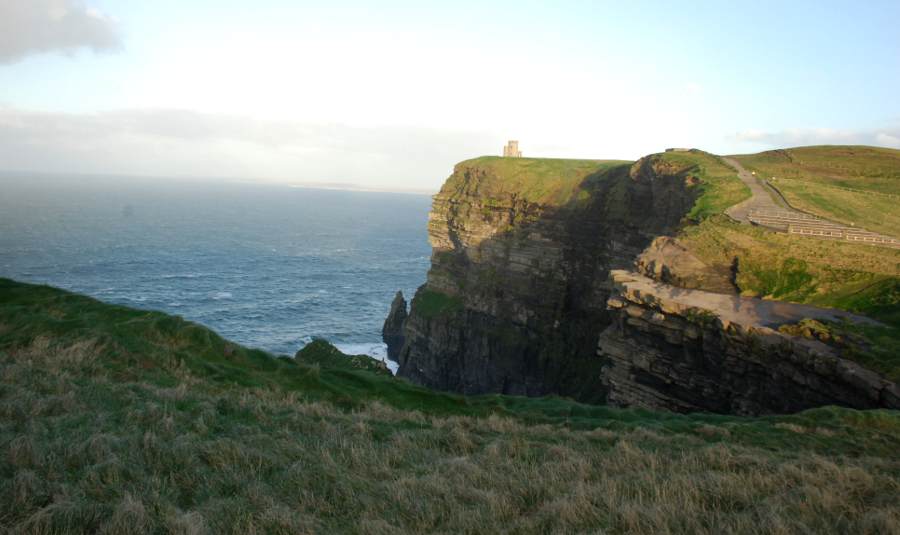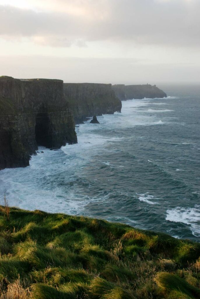 Les Cliffs of Moher valent vraiment la réputation qu’on leur attribue. Le soleil irise les falaises et teinte le rivage d’une belle lumière dorée. Saisissant et sauvage. Les falaises atteignent jusqu’à 214 m et sont parmi les plus hautes d’Europe. Elles forment un immense mur de 8 km de long qui tombe à pic dans la mer.