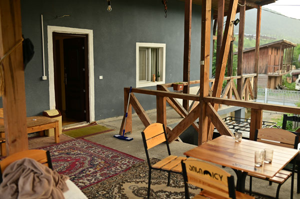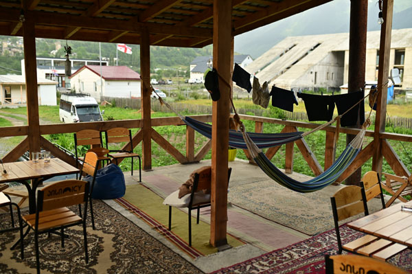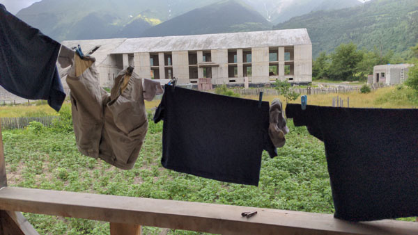 Derniers moments passés à Mestia. La nuit a été plus calme que les deux dernières. Sur la terrasse, mes affaires terminent de sécher. Otis a eu la gentillesse de les laver pour moi après ma mésaventure dans la boue des rues d’Ouchgouli.