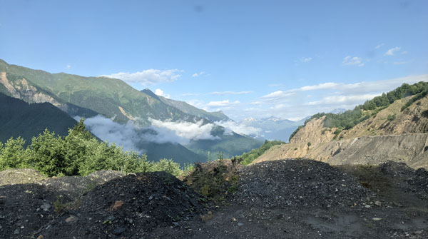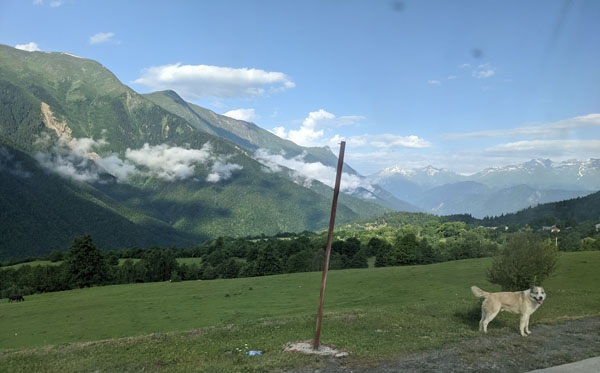 Voilà, du coup, et de tout mon cœur, je recommande vivement sa guesthouse, Lashmina Hôtel, pour tout son confort bien sûr, mais avant tout pour l’accueil et laide qui nous a été réservé. merci encore pour tout, Otis. En attendant l’arrivée du minibus qui doit venir nous prendre devant le portail de la guesthouse, je profite pour faire une dernière photo des montagnes du Caucase.
