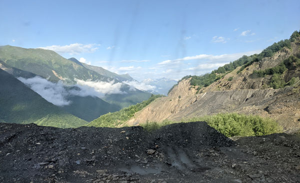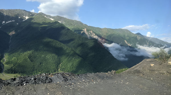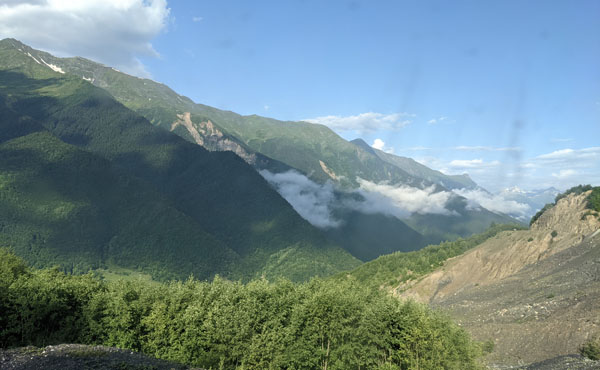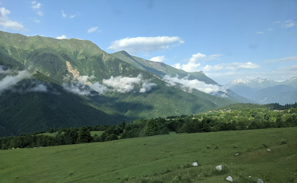 Avant d’atteindre les rives de la mer Noire, il nous faut d’abord longer pendant un bon moment les contreforts de la chaîne du Grand Caucase, puis filer vers l’ouest en évitant de traverser les régions séparatistes du nord occupées par les Russes depuis 2008. Et une fois encore, les paysages montagneux sont d’une grande beauté, sublimés par des nappes de brume et des nuages d’altitude.
