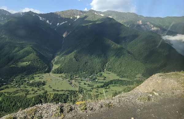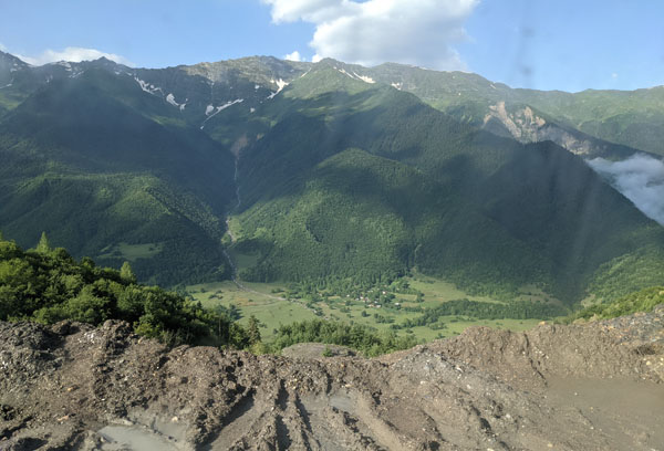 La route du retour va nous prendre environ une heure, sur une piste à moitié asphaltée et très souvent dangereuse. Pour ma part, je préfère regarder sur le côté où défilent les tours svanes de la communauté d’Ouchgouli.