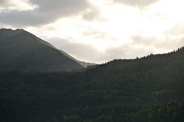 Enfin, après une heure trente de mauvaise route, nous commençons à nous éloigner de la haute montagne. Les pentes des montagnes se font plus douces, et surtout beaucoup plus vertes qu’en très haute altitude. Les flancs sont hérissés de forêts de sapins.