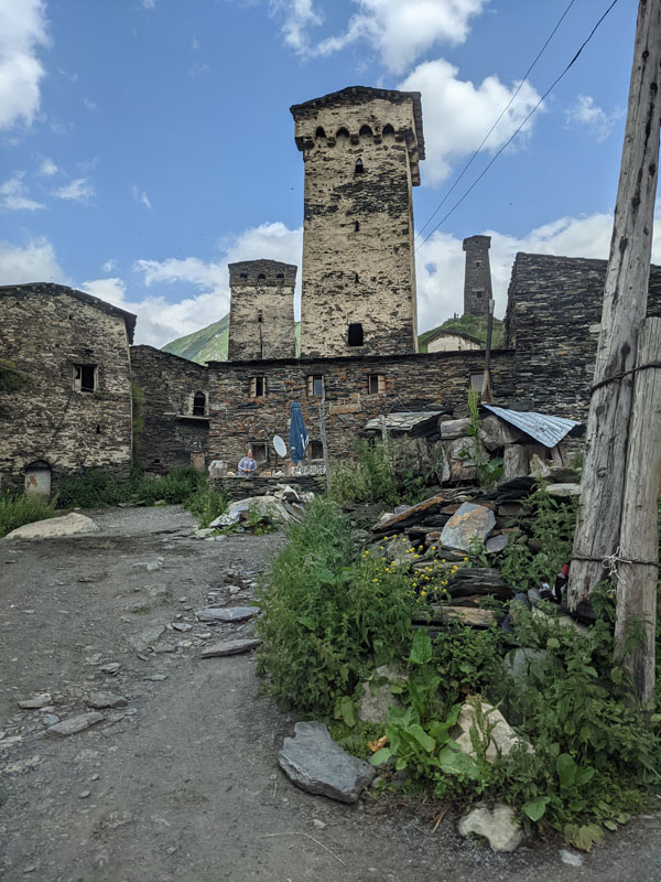 Mardi 12 juillet. Il est grand temps de partir pour revenir vers Mestia. Juste le temps de jeter un dernier coup d’œil à la cour et à la tour svane dans laquelle nous avons dormi cette nuit et nous repartons vers la capitale de la Svanétie.