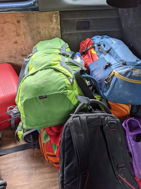 Pour ce chemin du retour, c’est le mari de Vera qui est au volant. Ici, le minibus assure le minimum. Les bagages sont placés à même le plancher et en route pour l’aventure ! Un dernier petit coup d’œil sur les bagages et sur mon sac photo qui est encore tout maculé de boue et nous pouvons y aller.