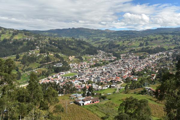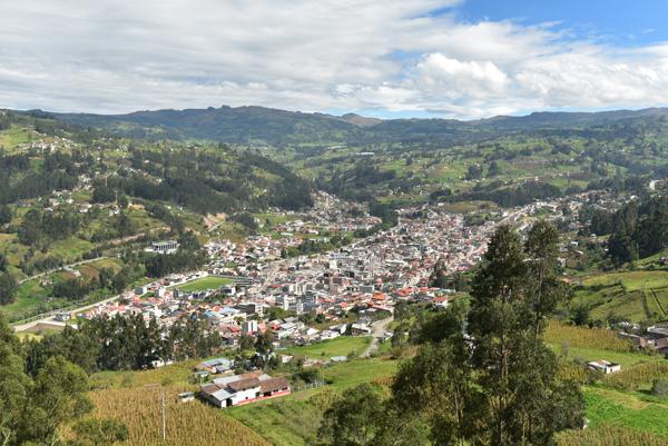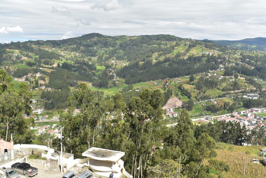 Mercredi 27 juin. Depuis le sommet du sanctuaire de la Virgen del Rocio, le paysage est magnifique. On a une vue imprenable du village de Biblian enfoncé au cœur de la vallée du Tomebamba.