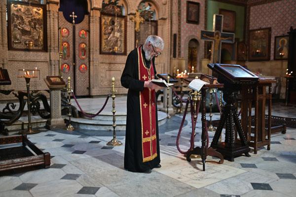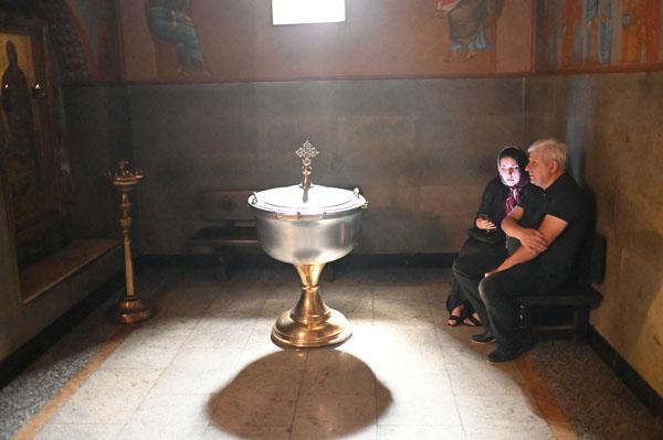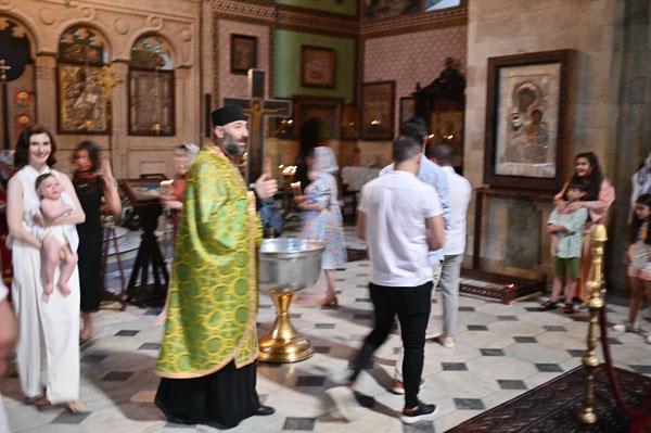 Les chants résonnent jusqu’au plus haut de la coupole et l’enfant pousse de petits cris. C’est merveilleux. Puis la famille tourne autour de la coupe d’eau bénite se perdant en prières tandis que des assistants du pope continuent à réciter leurs prières.
