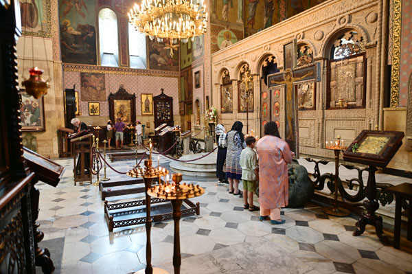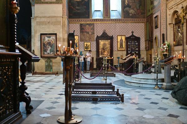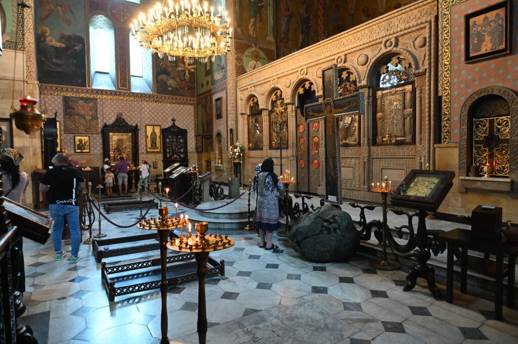 L’intérieur de la cathédrale offre une expérience sensorielle profonde, plongeant le visiteur dans l’atmosphère recueillie et mystique du christianisme orthodoxe géorgien. La pénombre est percée par la lueur des cierges qui scintillent devant les icônes, tandis que l’encens emplit l’espace. Les fresques, bien que souvent restaurées, dépeignent des scènes bibliques et des figures de saints géorgiens. Le point focal est sans conteste la croix de Sainte-Nino, précieusement conservée sous une vitre à droite de l’autel. Assister à un office, rythmé par les chants polyphoniques géorgiens, est une occasion unique de ressentir la foi vivante qui anime ce lieu depuis des siècles.