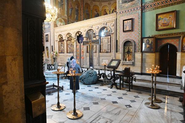 À gauche de l’autel se trouve la croix de vigne vénérée qui, selon la tradition, a été forgée par Saint Nino, une femme cappadocienne qui a prêché le christianisme dans le Caucase au début du IVe siècle. Le roi Vakhtang III a donné le reliquaire lui-même au début du XIVe siècle. La cathédrale de Sioni est l’endroit où le manifeste impérial russe sur l’annexion de la Géorgie a été publié pour la première fois. Le 12 avril 1802, le commandant en chef russe en Géorgie, le général Karl von Knorring, réunit les nobles géorgiens dans la cathédrale, alors encerclée par les troupes russes.