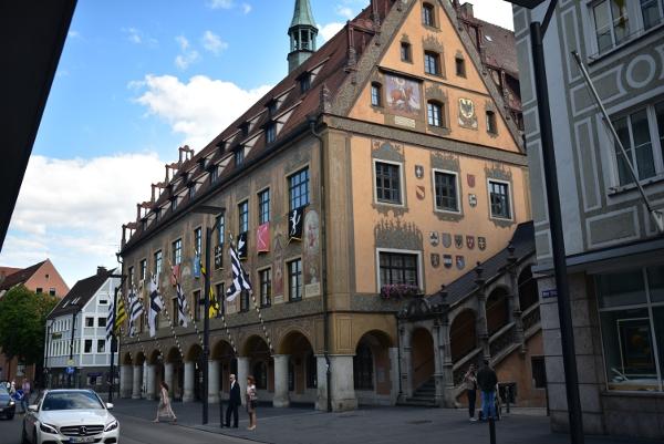 Samedi 15 juillet. Comme je l’ai écrit un peu plus haut, la ville d’Ulm fut l’objet d’un terrifiant raid aérien des Alliés durant la Seconde Guerre mondiale. Du coup, le centre-ville fut rasé à plus de 80 %… Sauf la cathédrale qui échappa par miracle au bombardement. Le Rathaus, symbole de l’ancienne ville médiévale, l’hôtel de Ville, fut entièrement détruit par les bombes alliées. Il fut alors décidé qu’il serait reconstruit à l’identique.