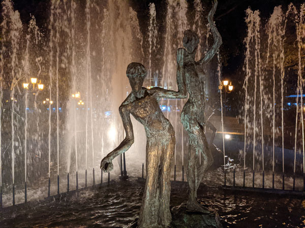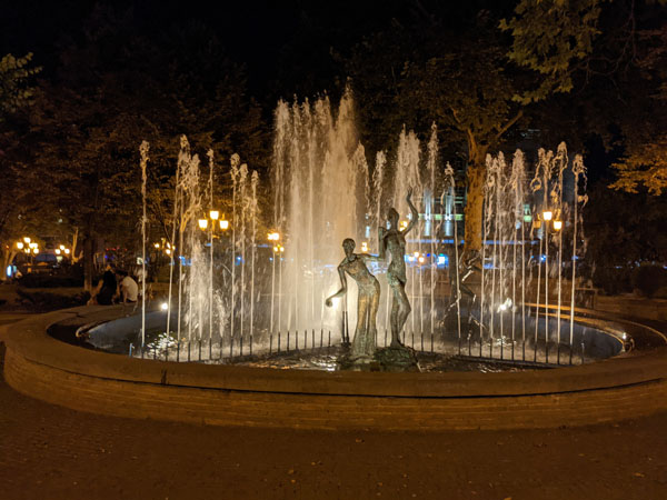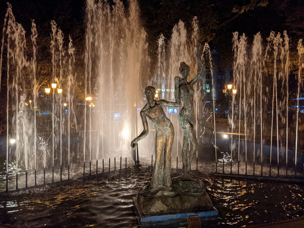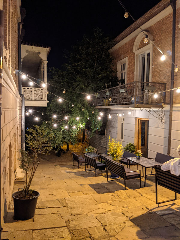 Pour amoindrir notre peine, nous allons dîner dans le même restaurant que la veille, au milieu de la rue Erekle II, où se mêlent étroitement touristes en goguette et jeunes couples géorgiens avides de passer une soirée tranquille entre amis. Plus tard, nous irons profiter une dernière fois des d’eau des nombreuses fontaines de la ville, puis faire un tour dans l’ancien quartier royal de la ville.