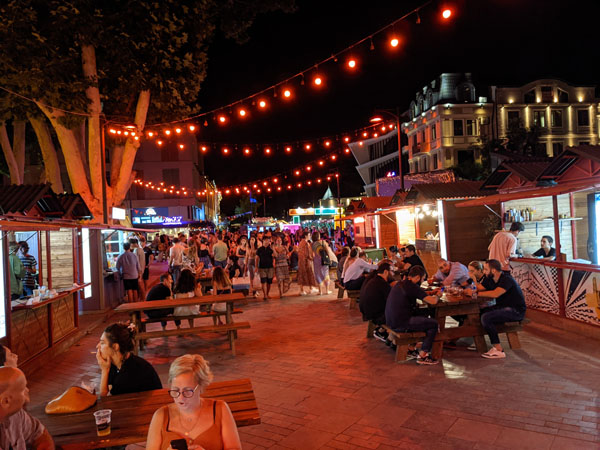 Sur le chemin du retour, nous passons par une place pleine d’animations où tous les jeunes de Tbilissi semblent s’être donnés rendez-vous. Ici, on s’assoit sur des bancs et on mange ce que l’on va acheter à des kiosques qui se trouvent partout autour de la place.