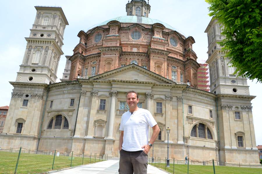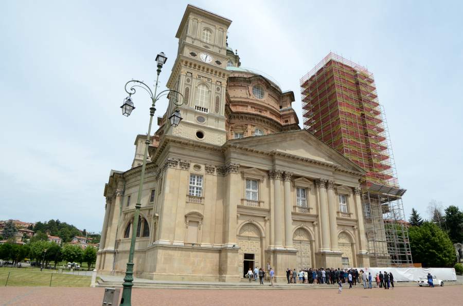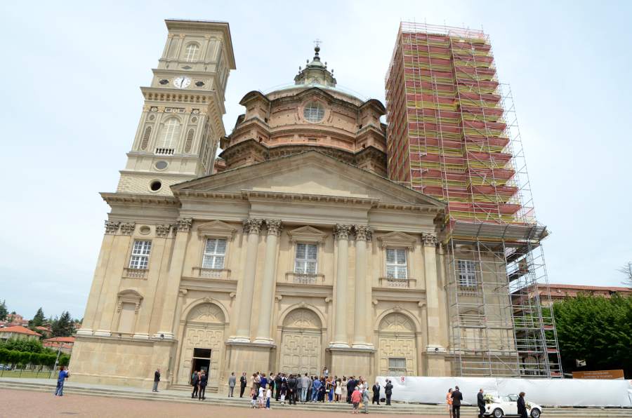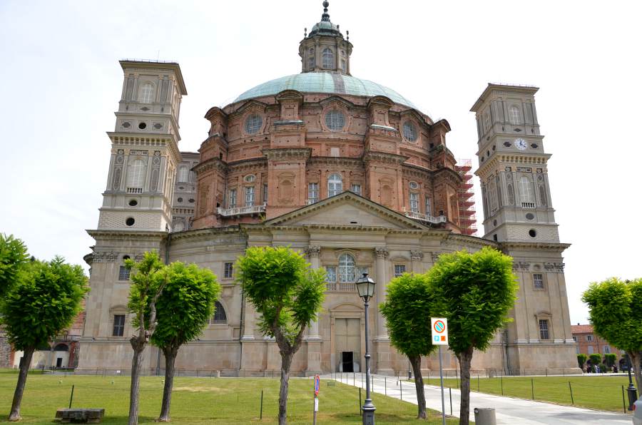 Après une bonne heure de route, nous voici arrivés. Dès le premier coup d’œil, le sanctuaire en impose. Le dôme est gigantesque, planté seul au milieu de la campagne piémontaise et d’une très belle place. On distingue très nettement trois architectures : la base en grès de style néoclassique construite à la fin du XVIe siècle, la partie supérieure en brique construite un siècle plus tard, puis enfin le dôme de style baroque, achevé en 1733… Les travaux intérieurs ne s’achevèrent qu’en 1752, soit plus de 150 ans après le début du chantier !