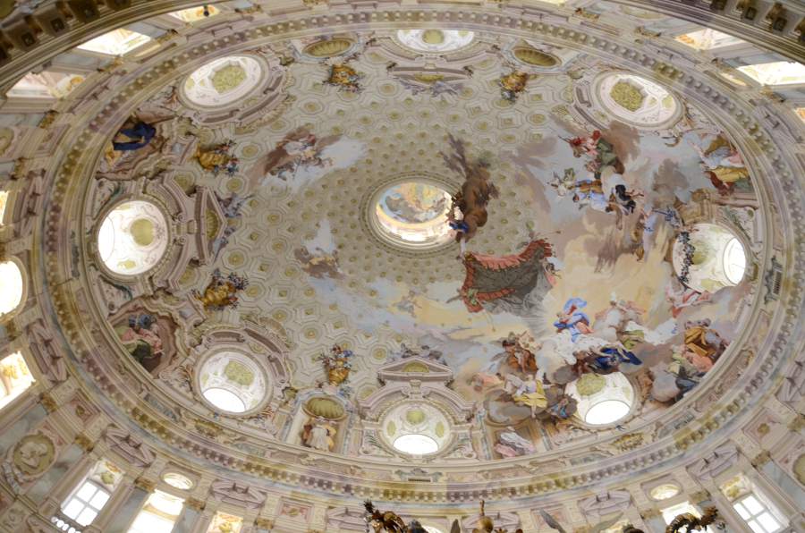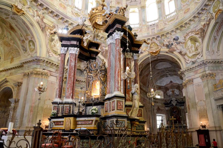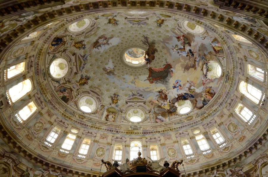 La visite révèle des fresques monumentales réalisées par des artistes de l’école piémontaise, dont le peintre baroque Sebastiano Ricci. L’intérieur présente un cycle pictural complet retraçant l’histoire du christianisme, avec une attention particulière aux scènes mariales. Les quatre pendentifs de la coupole illustrent les vertus théologales par des figures allégoriques grandeur nature.