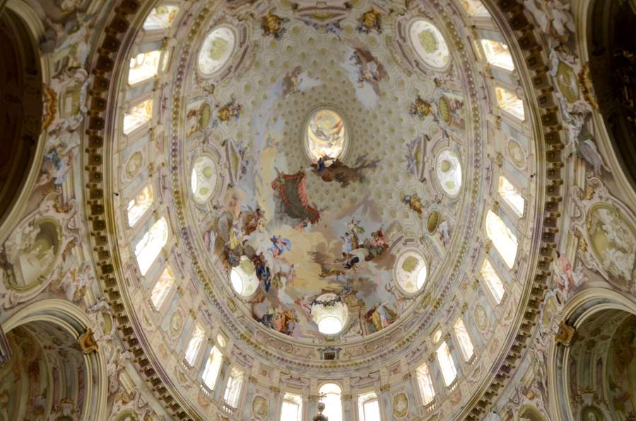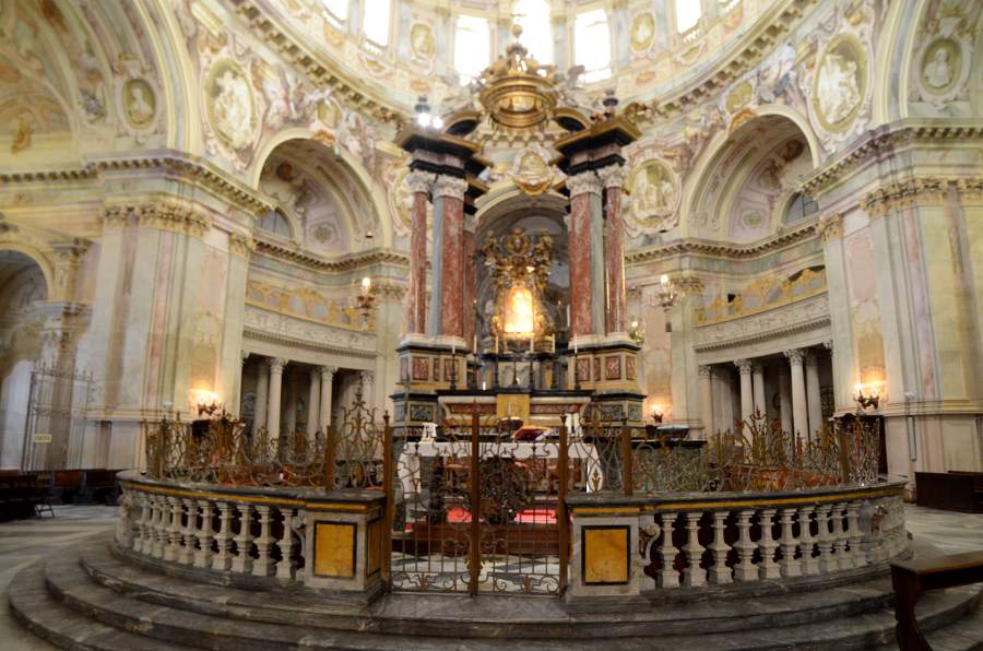 L’intérieur se découvre en commençant par la nef centrale pour admirer l’ellipse de la coupole, puis en circulant dans le déambulatoire pour observer les chapelles latérales. La sacristie renferme des ex-voto et des objets liturgiques historiques. La montée à la coupole exige de gravir 135 marches mais offre une vue exceptionnelle sur les fresques de la voûte et les collines alentour.