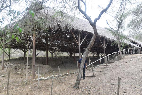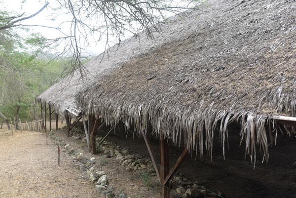 Toutefois, les archéologues et les conservateurs du site ont cru bon de reconstituer une ancienne maison commune sur l’emplacement même de la plus importante d’entre elles. Une charpente de bois soutient désormais un toit fait de feuilles de palmiers et de bananiers.