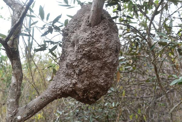 Passé cette habitation, Fernando m’emmène au cœur des ruines d’Agua Blanca. En relevant la tête j’aperçois une superbe termitière ayant colonisé la branche d’un arbre.