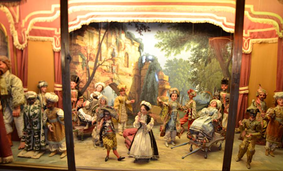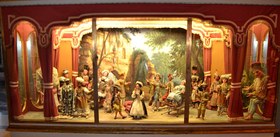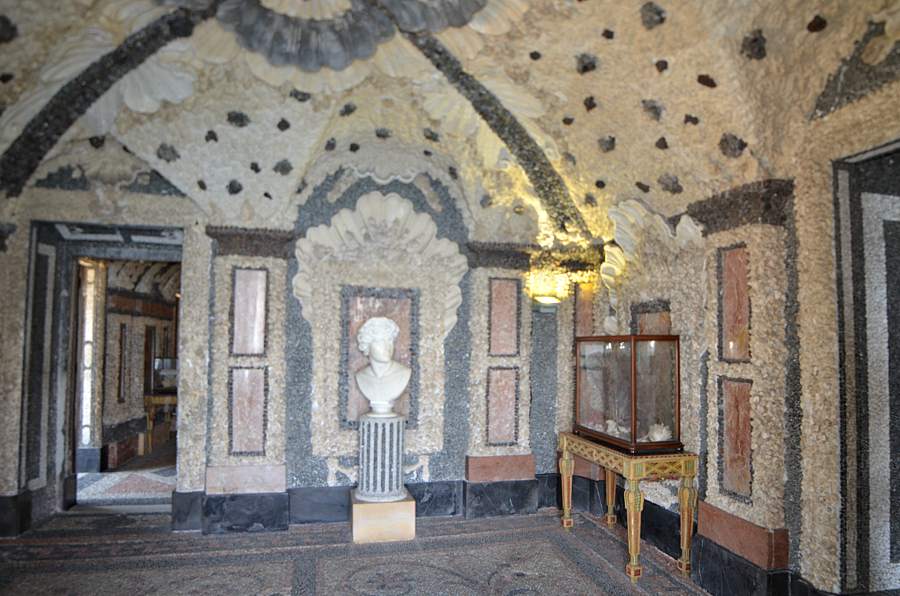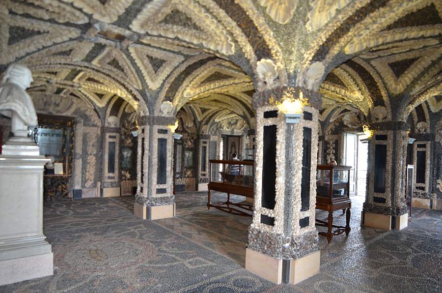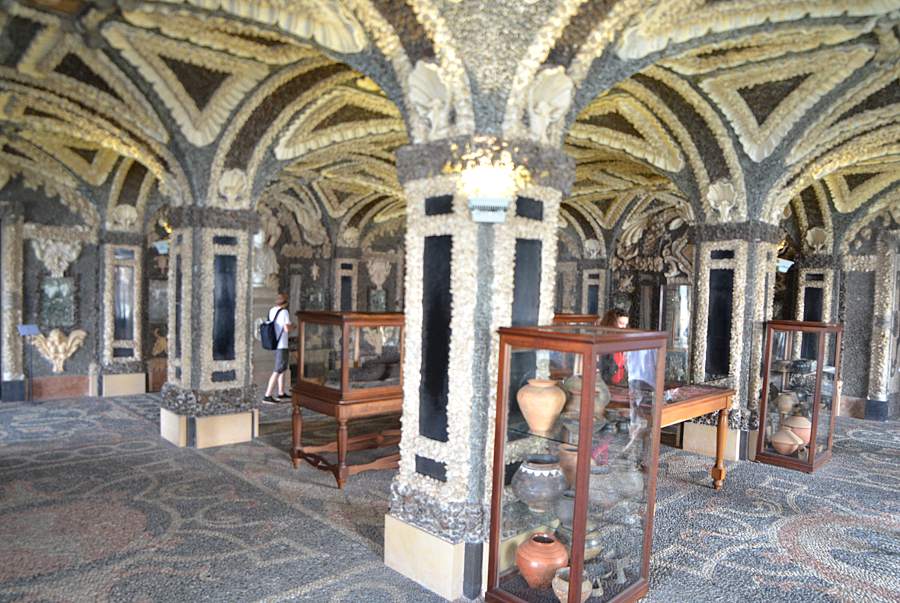 Passé la salle qui abrite le fameux théâtre de marionnettes, nous voilà descendus au sous-sol pour la visite des grottes, des salles tapissées de coquillages et de petits cailloux. Du jamais vu !