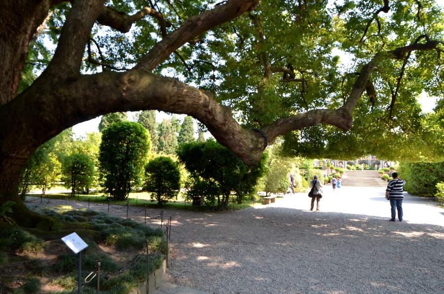 On passe la terrasse et la cour d’apparat et nous voici à la pointe ombragée par de jolis pins parasols. Une longue terrasse de gravier blanc remonte vers le palais, bordée de superbes massifs colorés. Les pluies ont été importantes cet hiver… Du coup, les pins plantés au bord de la plage ont encore les pieds dans l’eau.