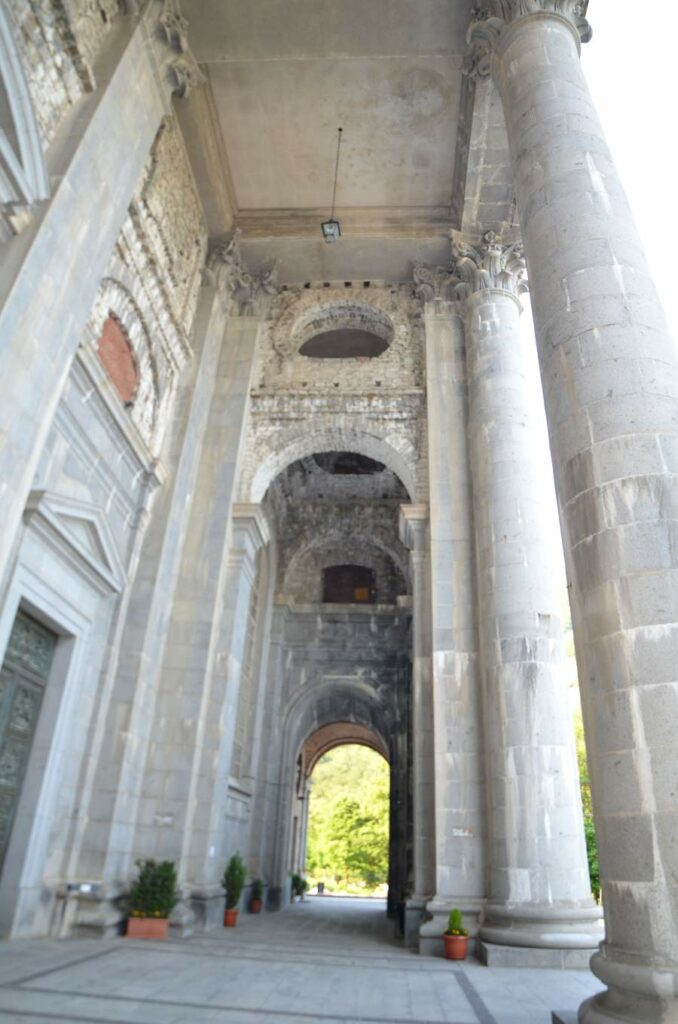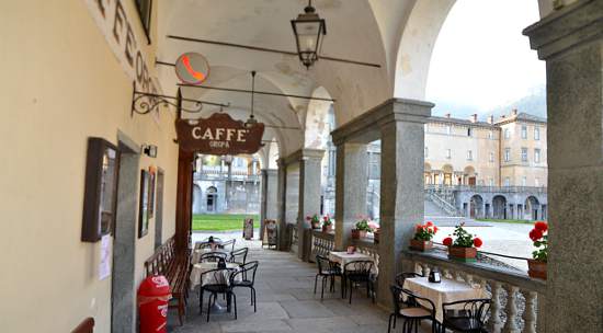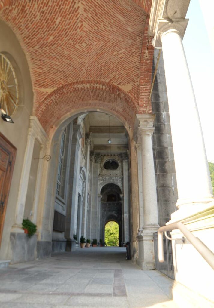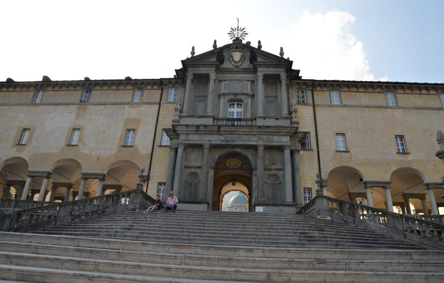 Et nous voici enfin devant ce vaste ensemble architectural dont le point d’orgue est le Sacro Monte di Oropa, classé au patrimoine mondial de l’Unesco. Il s’agit de douze chapelles (XVIIe et XVIIIe siècle) dédiées à la vie de la Vierge. L’ensemble est impressionnant, et situé à environ 1.200 mètres d’altitude, dans un amphithéâtre de montagnes entourant la ville. Du coup, le site en lui-même est d’une beauté incroyable. Le sanctuaire couvre une Montagne Sacrée (Mont de la Sainte Oropa), l’église a été édifiée sur la base d’une ancienne chapelle.
