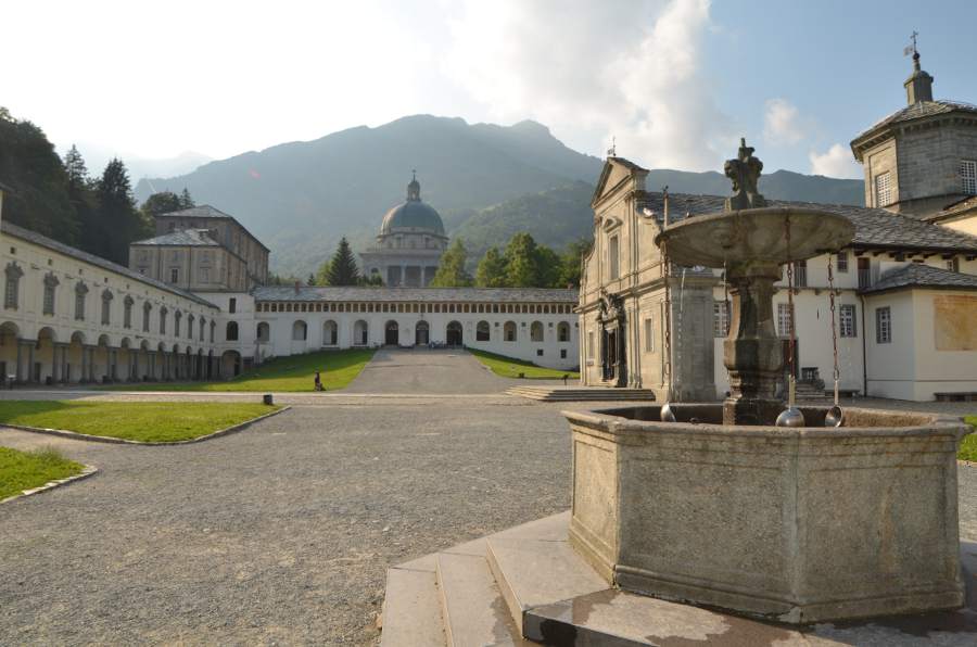 Le sanctuaire se distingue par son architecture évolutive qui couvre six siècles : la basilique antique (1600-1620), le grand cloître de l’architecte Guarini (XVIIe siècle), et la basilique supérieure néoclassique (1885-1960) dominée par son dôme de 80 mètres. Cet ensemble monumental s’intègre dans un paysage sacré où douze chapelles votives du Sacro Monte ponctuent l’ascension vers le sanctuaire.