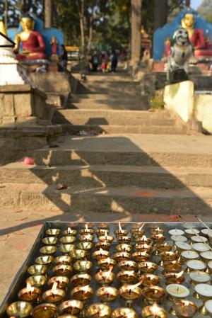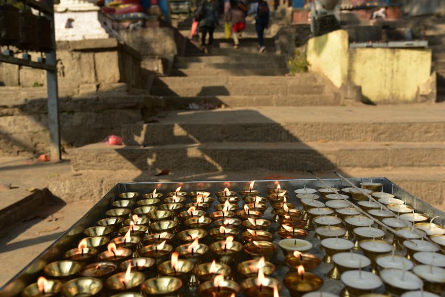 Le taxi a la bonne idée de me laisser au pied du temple bouddhiste. Un escalier de 365 marches, comme autant de jours dans l’année, permet de gravir la colline qui débouche directement sur le grand stûpa. Une longue ascension qui débute par le traditionnel rite de la bougie que l’on allume pour rendre hommage au bouddha.