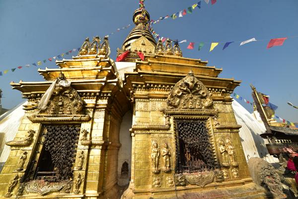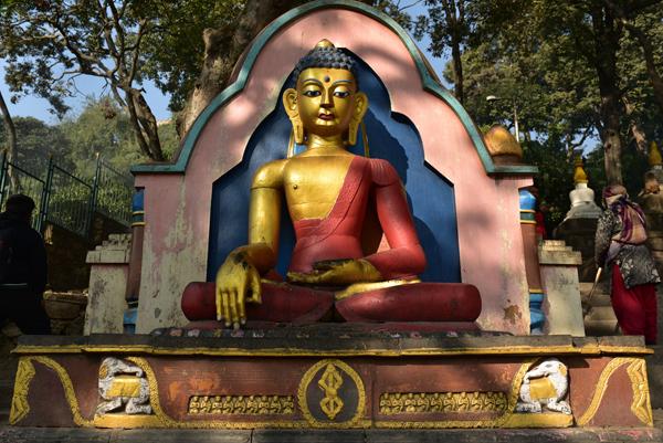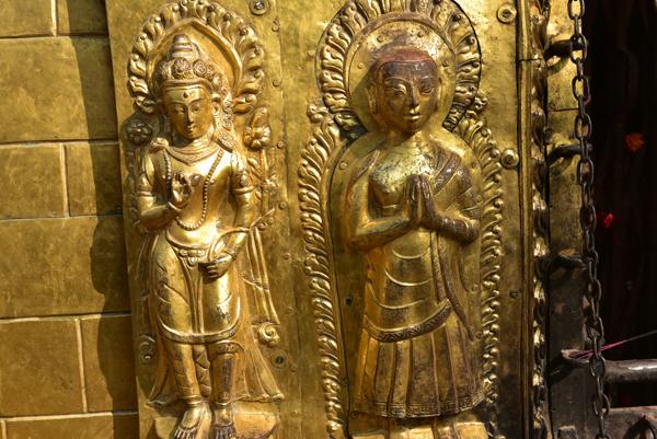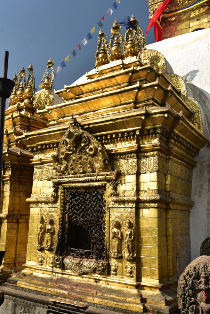 Les niches du stûpa abritnt les cinq Dhyani Bouddha et leurs montures : l’Akshobhya sur un éléphant, Vairocana sur un lion, Rartnasambhava sur son cheval, au nord le plus vénéré de tous, Amitabha sur son paon, et Amoghasiddhi sur l’oiseau sacré Garuda. Entre ces cinq bouddhas transcendantaux qui représentent les éléments cosmiques, la terre, l’eau, le feu, le vent et l’éther, d’autres niches abritent leur quatre compléments féminins, les Bouddhashakti.