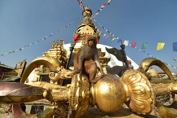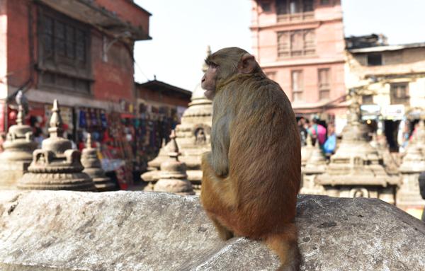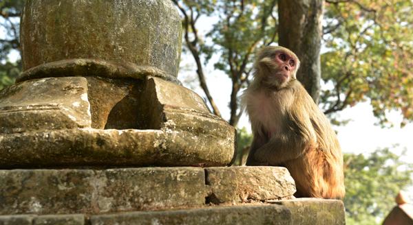 Même si la première inscription date de 1129, le stûpa de Svayambhunath est un des sites religieux les plus anciens de la vallée de Katmandou. A l’ouest de celui-ci se dresse d’ailleurs le temple de Manjushri vénéré par les Hindous pour rappeler que c’est ici que le dieu de la connaissance du même nom trouva au milieu du lac originel un lotus et fendit d’un coup d’épée les montagnes pour créer la vallée… En attendant, c’est justement un singe qui m’acceuille au pied du Monkey Temple. Incroyable !