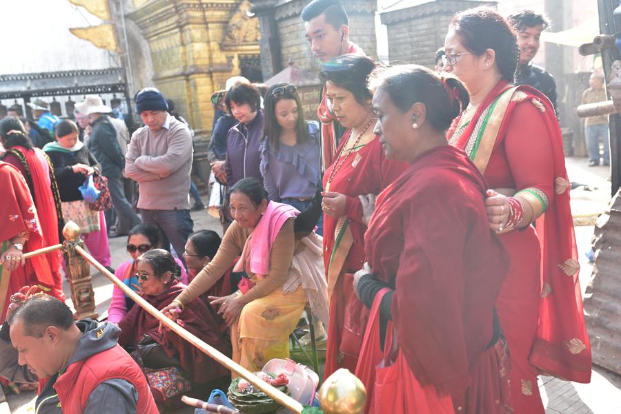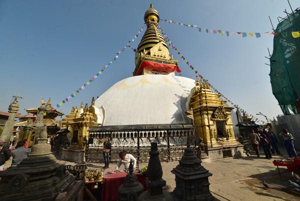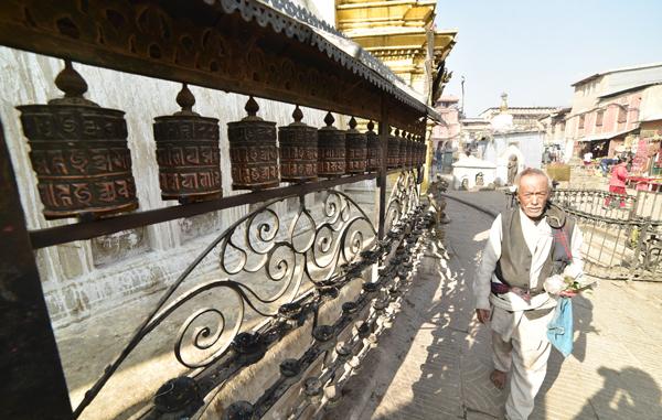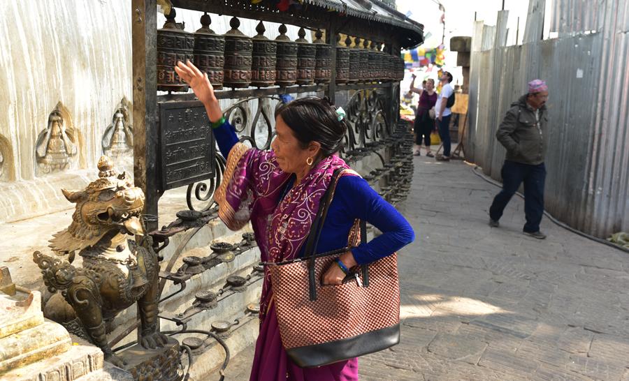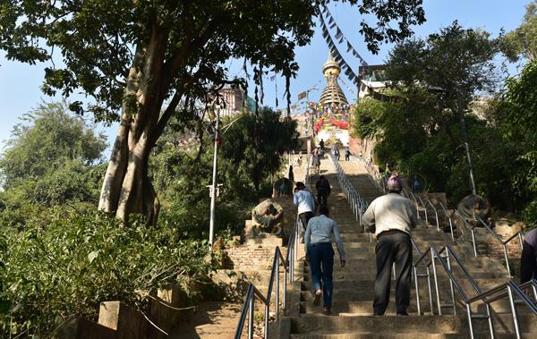Chaque matin avant l’aube, les centaines de pèlerins montent les 365 marches du côté est qui mènent en haut de la colline, passant le Vajra doré et deux lions gardant l’entrée, et commence une série de circumambulations dans le sens des aiguilles d’une montre autour du stupa.