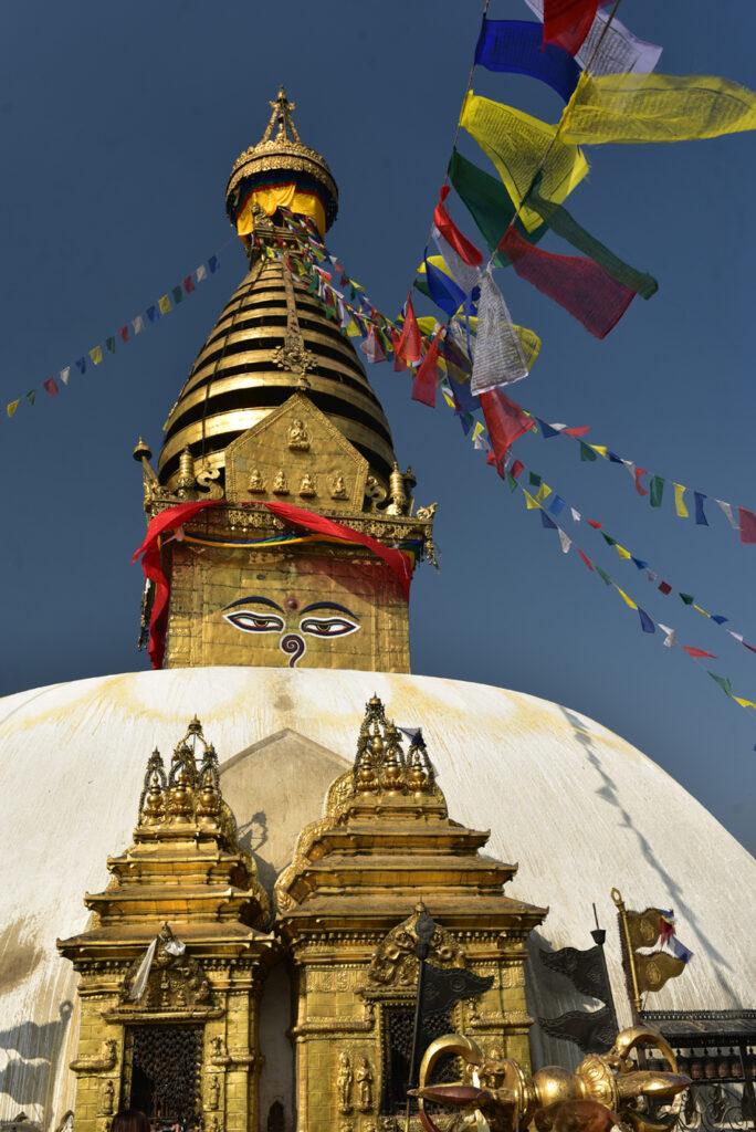 En relevant la tête, impossible de ne pas croiser le regard de Bouddha peint sur les quatre côtés de la tour du stûpa. Ils font partie de la symbolique complexe de ce lieu sacré.