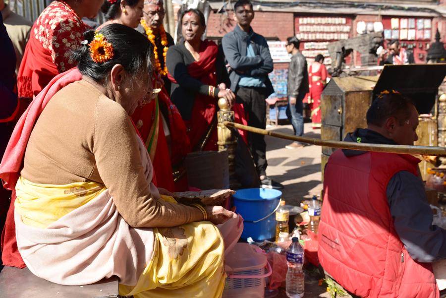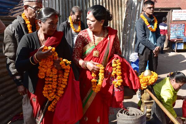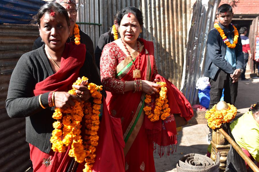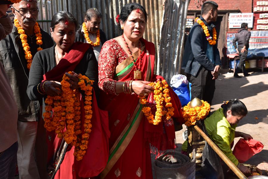 D’autres viennent à la rencontre des prêtres chargées d’offrandes et de colliers de fleurs. ça me rappelle un peu notre arrivée à l’aéroport de Katmandou et le beau collier de fleurs qu’on m’a passé au cou…