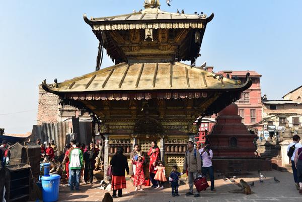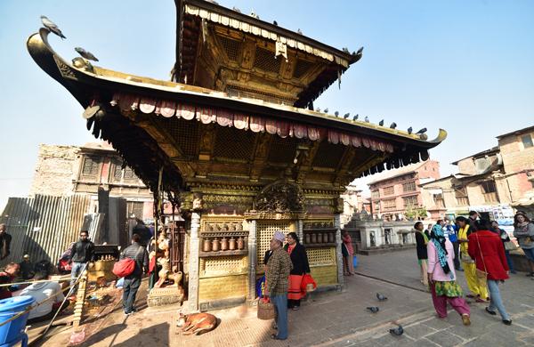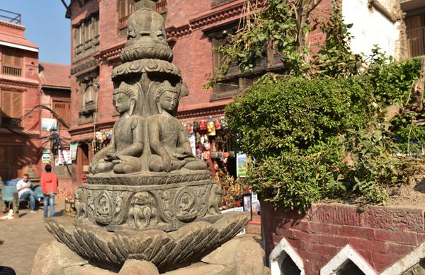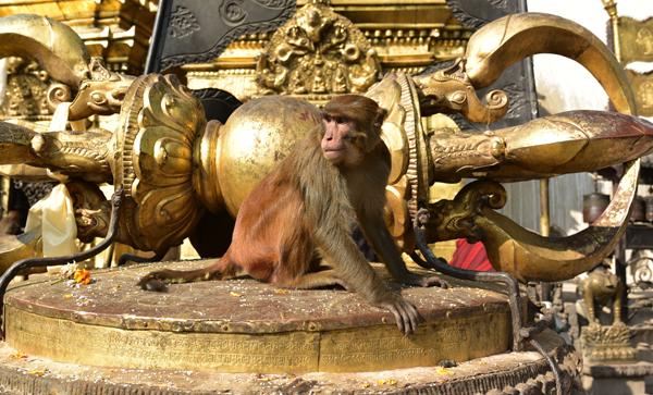 Bon, je retrouve de nouveau mon petit singe qui a pris ses quartiers sur le Vajra doré élevé ici en 1667 par le roi Pratapa Malla. Il repose sur un mandala dont le socle est orné du calendrier tibétain avec les signes du zodiaque. Le Vajra représente la foudre, arme divine dans la mmythologie hindoue, alors que pour les bouddhistes, c’est un sceptre de diamant, symbole de l’absolu.