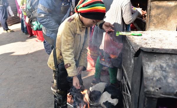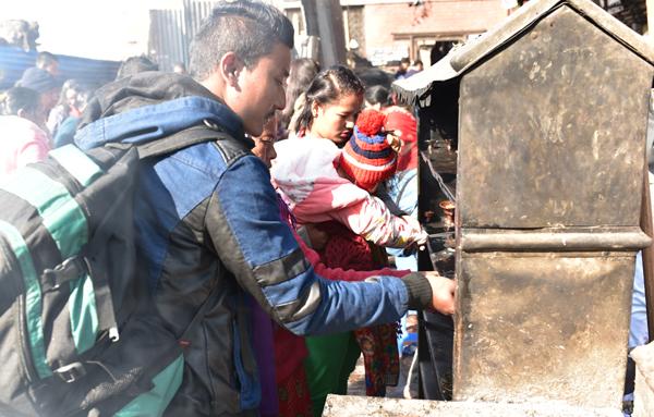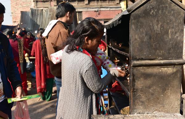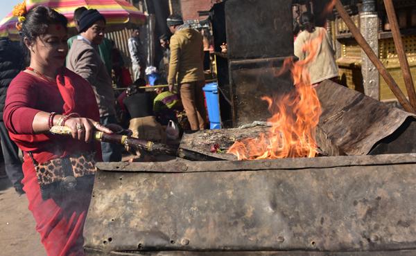 Autour du stûpa, les scènes se poursuivent. Chacun vient tour à tour attiser le feu sacré.