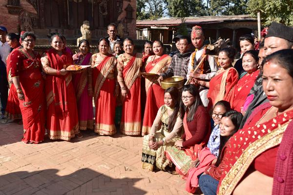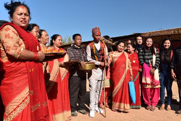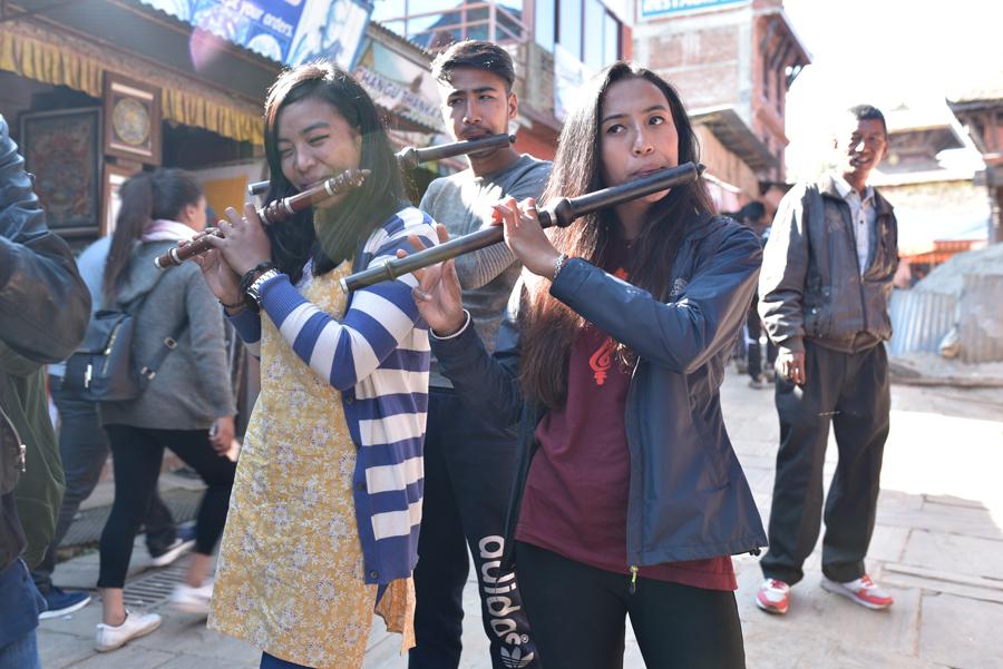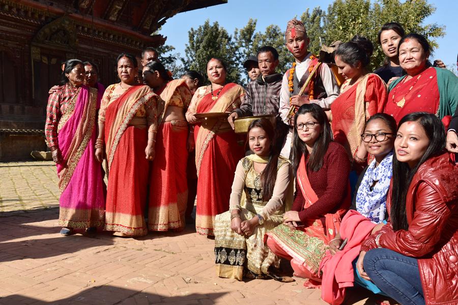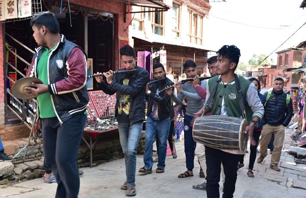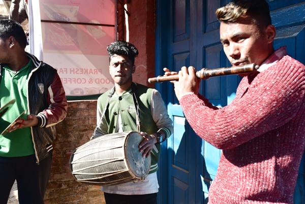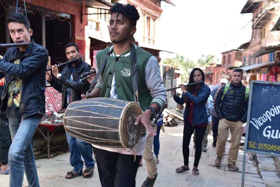 oilà un épidode que j’intitulerais volontiers “miracle à Changu Narayan” ! Et pour cause, alors que nous visitons Pierre et moi le temple de Narayan, voilà que de la musique résonne. Des flutes et des cymbales se font entendre… Des musiciens passent la porte de la cour du temple. Et bientôt une trentaine de personnes habillées de leurs lus beaux atours… Il s’agit d’un mariage traditionnel.
